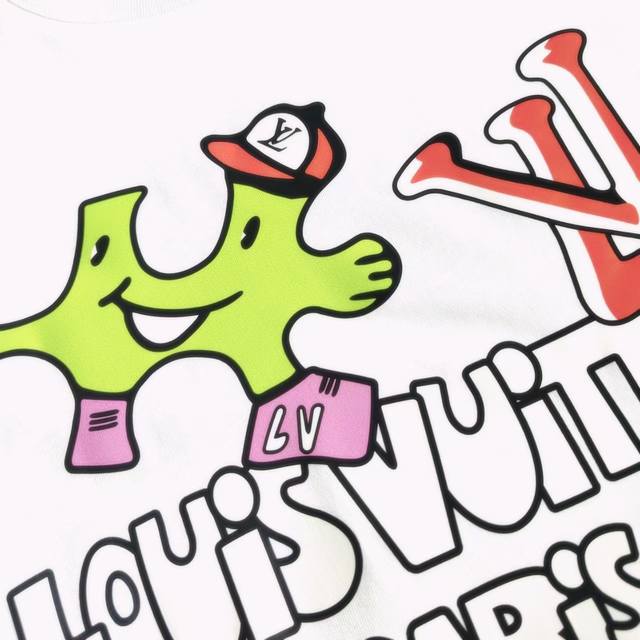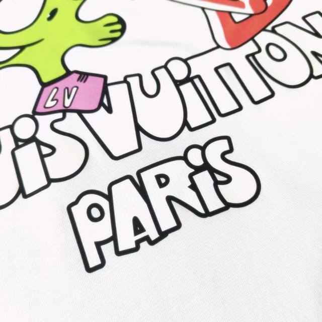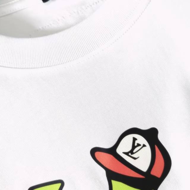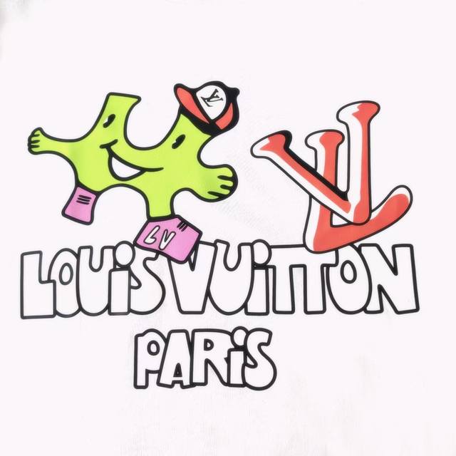 Real Shot Details + Size Chart Louis Vuitton Cartoon Logo Short-Sleeve T-Shirt Fabric: Washed Combed Cotton, Soft and Smooth, Loose Fit, Unisex Colors: Black, White Sizes: Xs, S, M, L