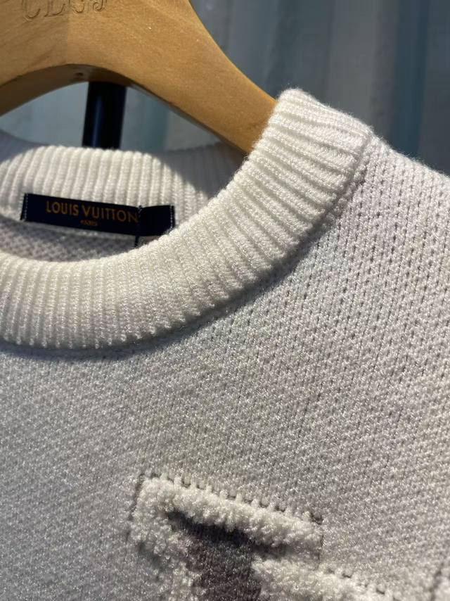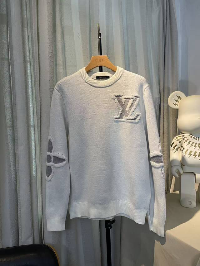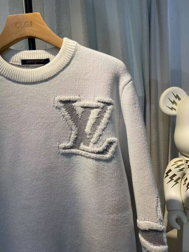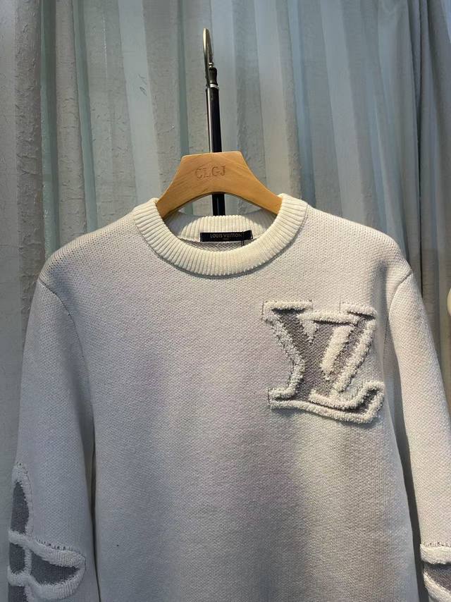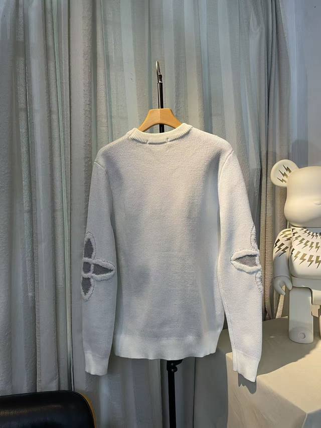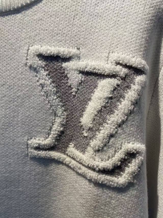 Real shot top version. Official website quality. Item number: T98. #Louis Button# Louis Vuitton logo jacquard knitting. This Lv jacquard sweater combines classic monogram with delicate knitting techniques. The iconic four-leaf clover pattern is presented in a three-dimensional jacquard design. The simple silhouette subtly reveals its luxury brand identity. It can be worn alone or layered for everyday wear, showcasing your taste in a low-key way. Made from a select skin-friendly knit fabric, it offers both warmth and comfort. Whether paired with jeans for a casual look or with suit trousers for a sophisticated style, it can be perfectly styled, helping you easily stand out in autumn and winter outfits and unlock your own luxurious and trendy style. Sizes: Xs, L. Colors: White, Blue.