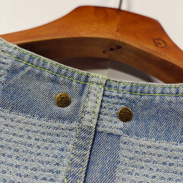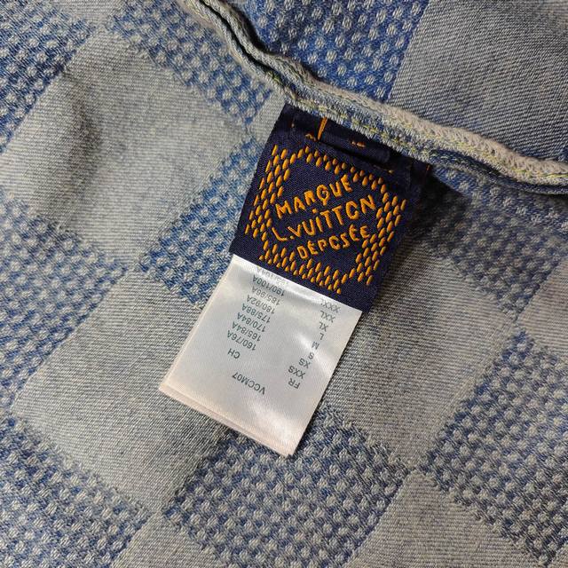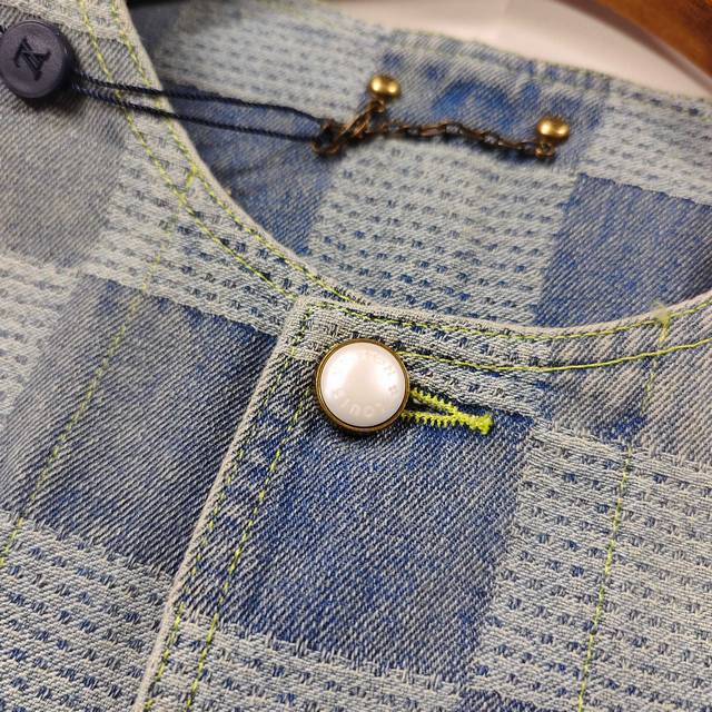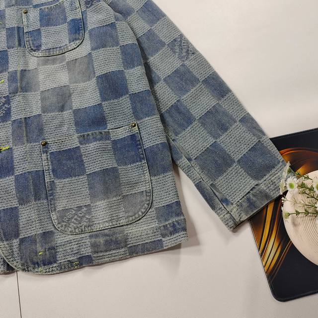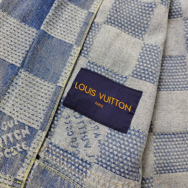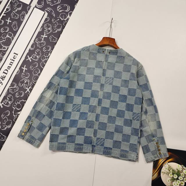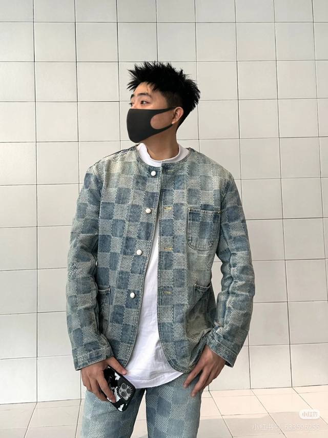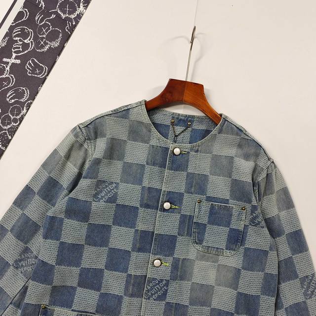 Marque L.Uuittondeposee logo is integrated into the 3D Damier jacquard pattern, sand-washed, collarless, with a curved hem, front patch pockets including a chest pocket, distressed snaps, cuff button details, no lining, and new pearl series buttons. The fabric features an exquisite checkered pattern, and the jacquard technique creates a three-dimensional and layered effect. While retaining the inherent toughness, wear resistance, and durability of denim, the jacket is also durable, enhancing its durability. The distressed, sand-washed, whitened look is achieved through sand-washing and a special dyeing technique, allowing the natural wear and fading of the denim to create a vintage and historical look. The absence of a traditional collar emphasizes comfort and freedom; the curved hem fits the body curve better. The placket is opened and closed with a new pearl button; the cuffs are embellished with ancient gold snap buttons, full of details, absolutely a high-end version