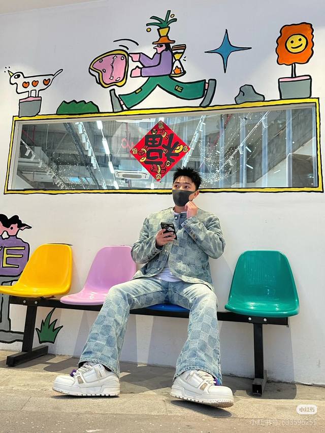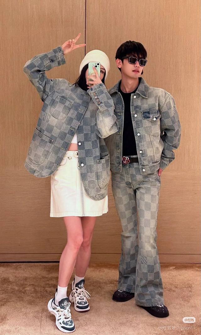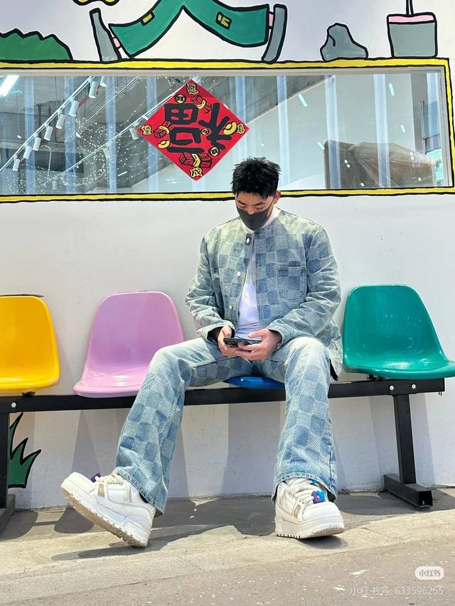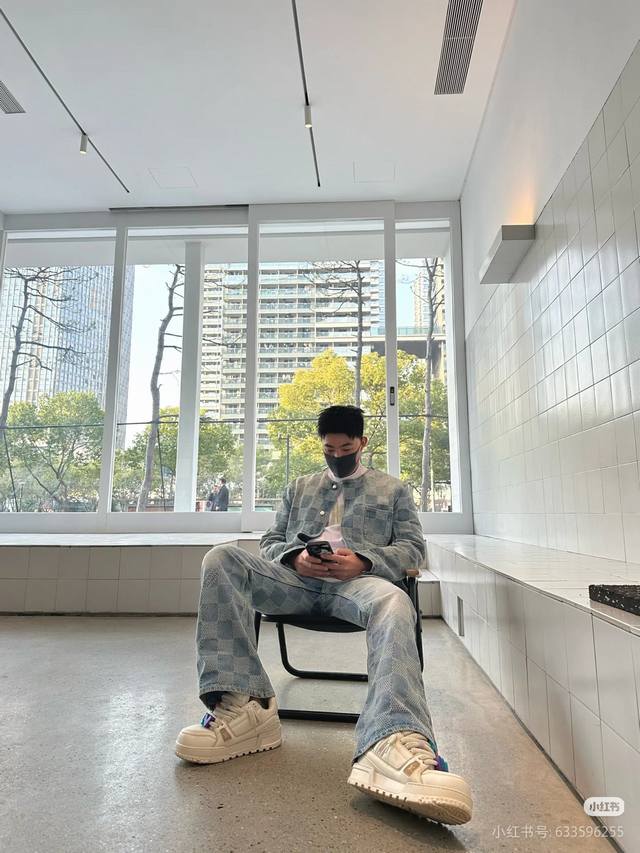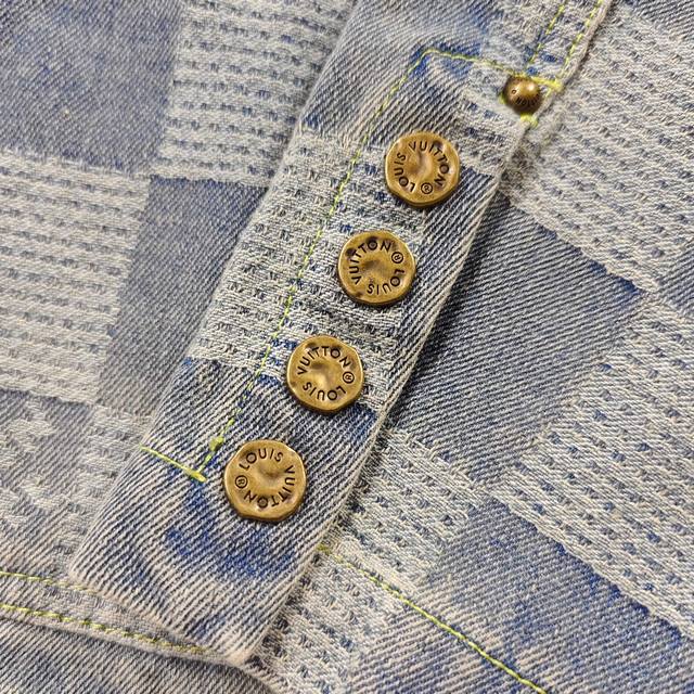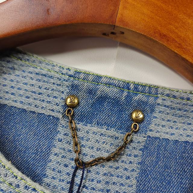 Marque L.Uuittondeposee logo is integrated into the 3D Damier jacquard pattern, sand-washed, collarless, with a curved hem, front patch pockets including a chest pocket, distressed snaps, cuff button details, no lining, and new pearl series buttons. The fabric features an exquisite checkered pattern, and the jacquard technique creates a three-dimensional and layered effect. While retaining the inherent toughness, wear resistance, and durability of denim, the jacket is also durable, enhancing its durability. The distressed, sand-washed, whitened look is achieved through sand-washing and a special dyeing technique, allowing the natural wear and fading of the denim to create a vintage and historical look. The absence of a traditional collar emphasizes comfort and freedom; the curved hem fits the body curve better. The placket is opened and closed with a new pearl button; the cuffs are embellished with ancient gold snap buttons, full of details, absolutely a high-end version