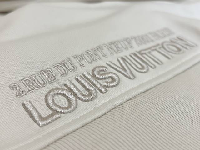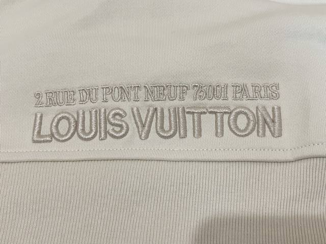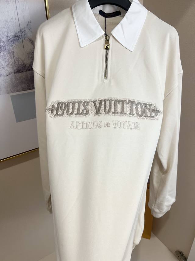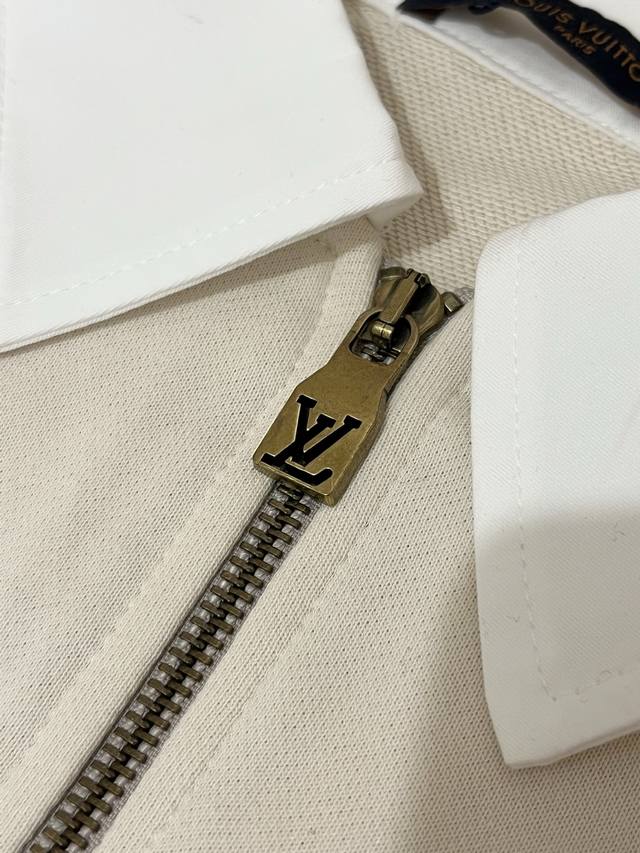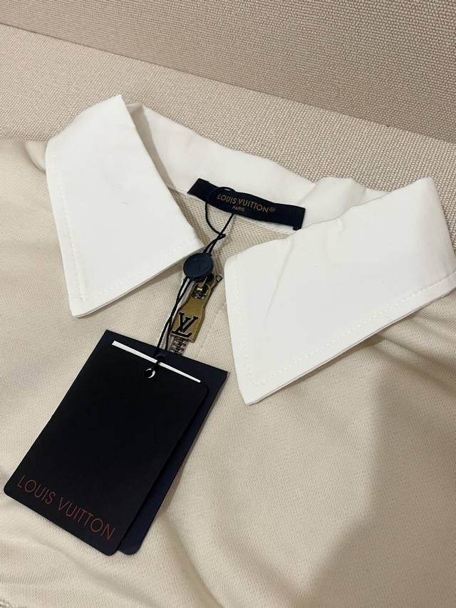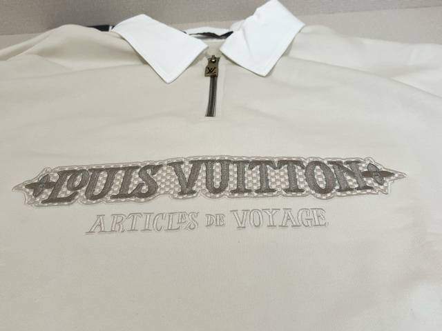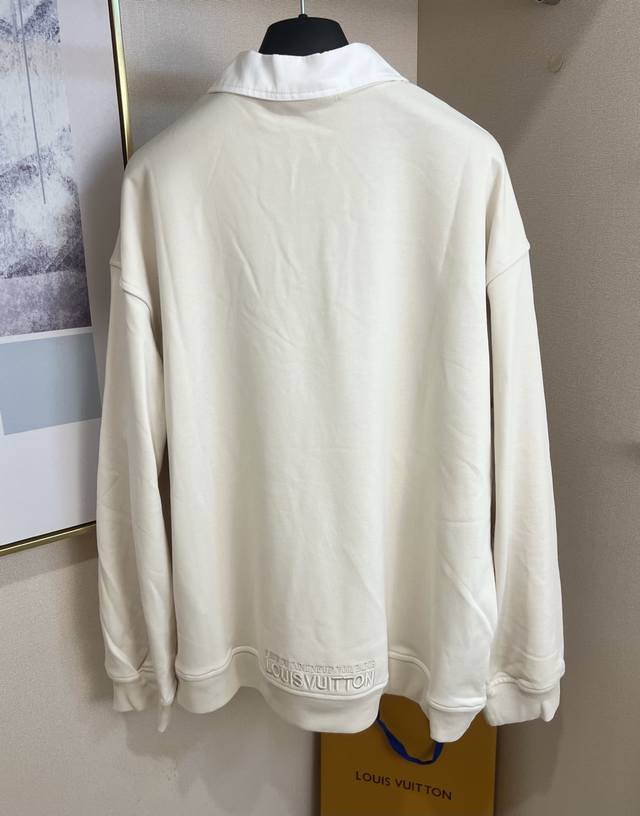 1V Louis Vuitton 2025Fw Early Fall Collection. Long-sleeved sweatshirt with a knitted cotton lapel and zippered patch. This sweatshirt features cotton dyed in an elegant hue and features a knitted shirt collar and a modern half-zip neckline for a relaxed, cruising look. A Louis Vuitton patch on the chest adds volume, while embroidered Louis Vuitton logo accents the back waist.