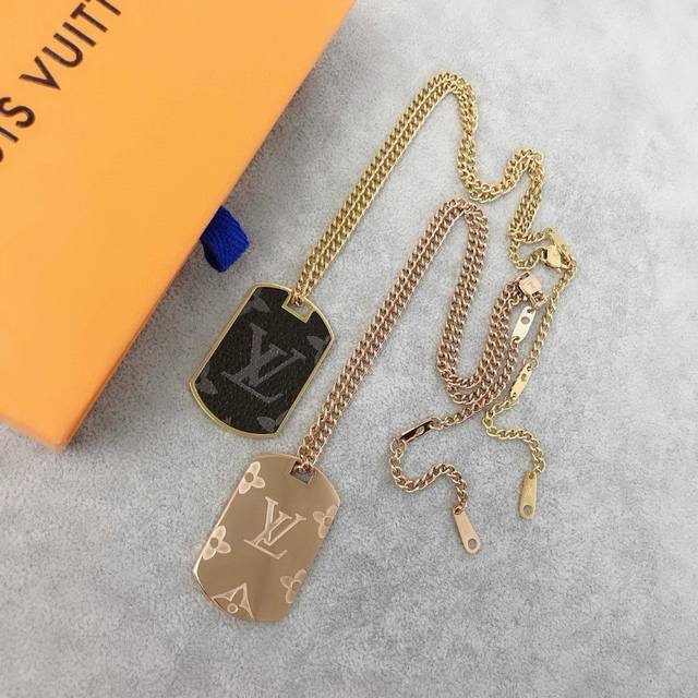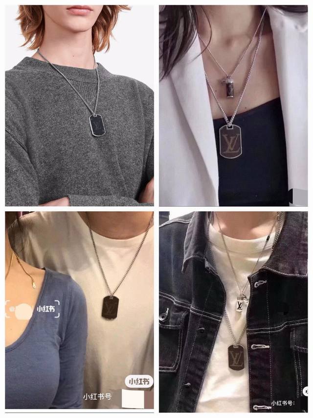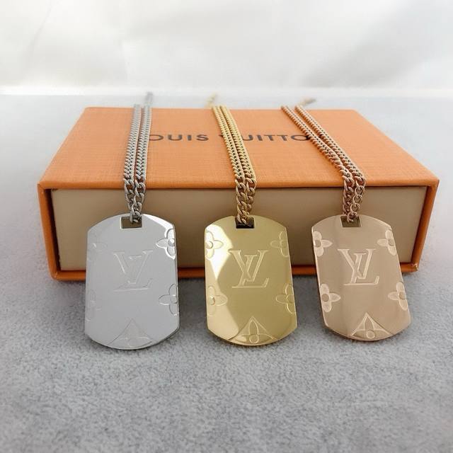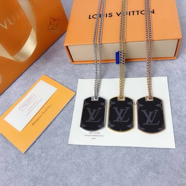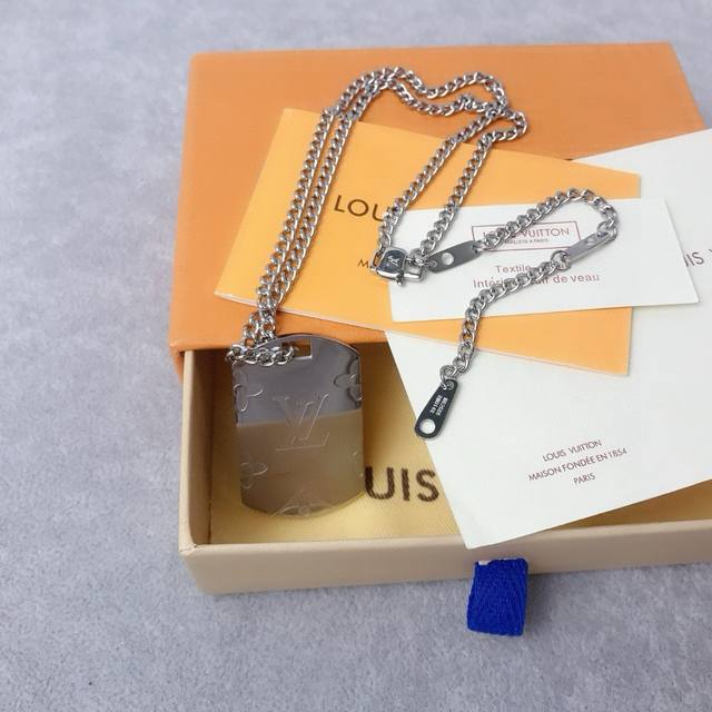 Special offer, silver Louis Vuitton nameplate necklace (discontinued). Officially selected and sold in boutiques. Looks great with a sweater. Full packaging. Top-quality replica for comparison. Sold in boutiques. Stainless steel with electroplating. Double-sided LV logo and monogram tag. Highly stylish. Authentic LV logo stamp, clearly visible engraving. Original hardware, thick gold plating, meticulous details. Highly stylish and versatile. Available in three colors, suitable for both men and women. The metal hardware is wrapped in the iconic Monogram Eclipse canvas, showcasing a mature and masculine charm. The nameplate pendant features a hinged design, providing a discreet place for the wearer to keep it safe.