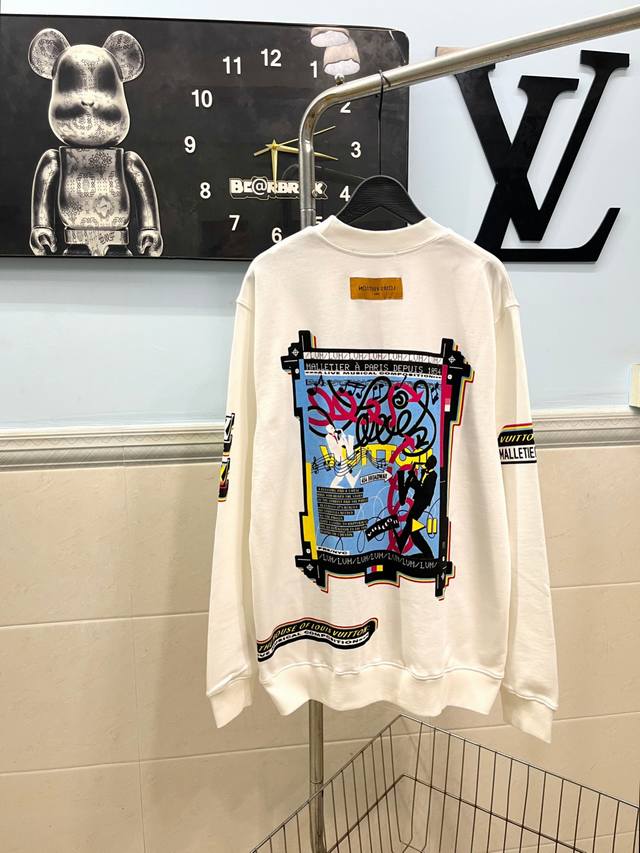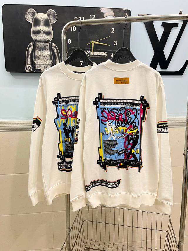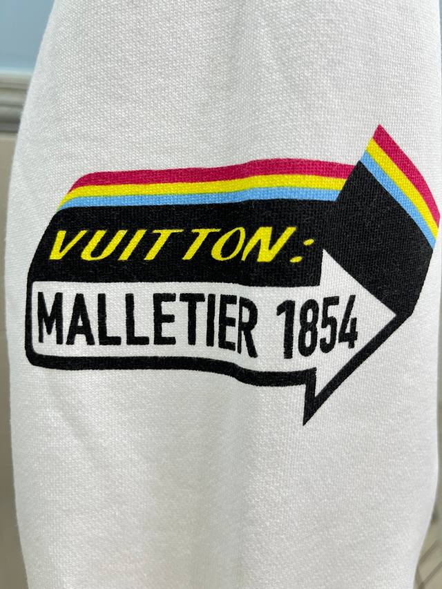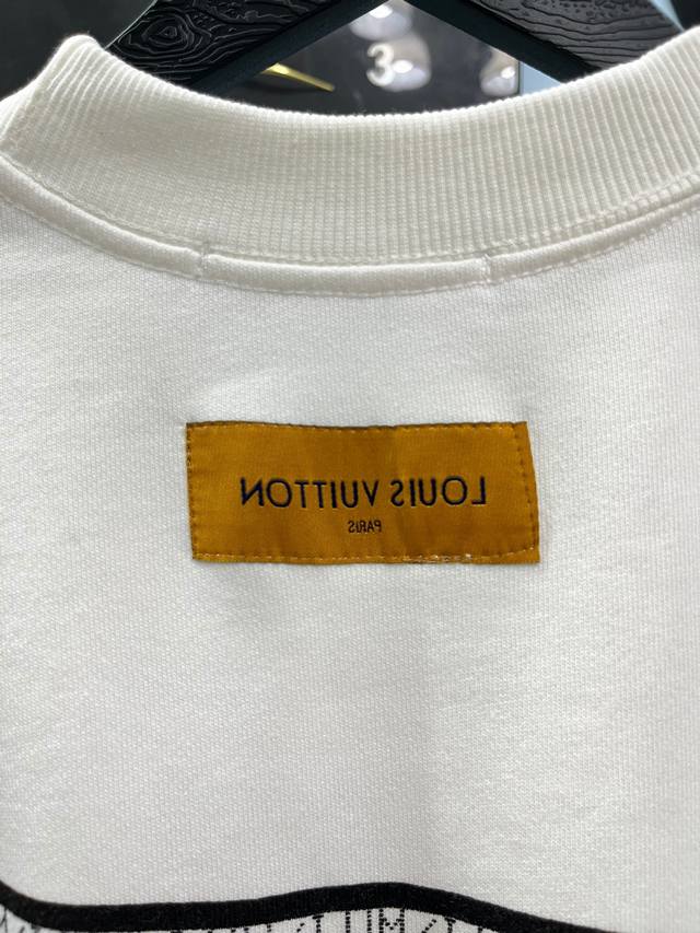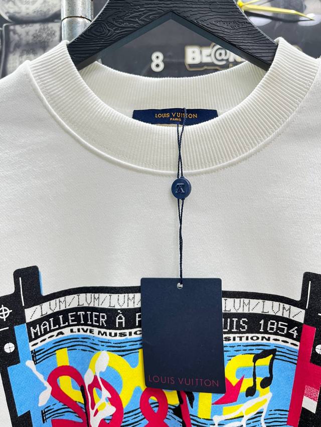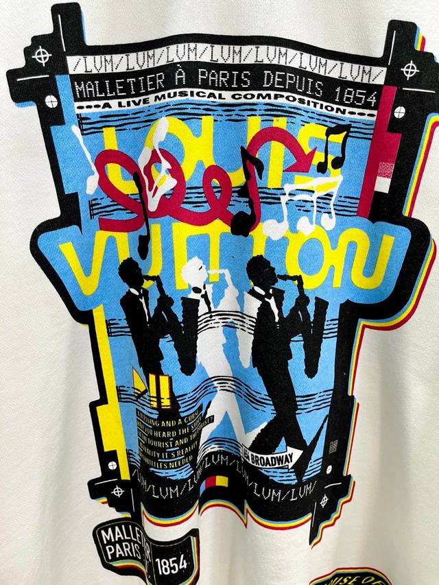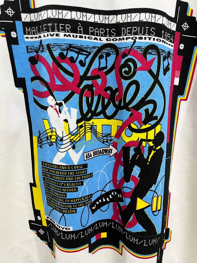 Style No. 245 Louis Vuitton - LV Band Musician Crew Neck Short-Sleeve Shirt. Made of 420g high-weight pure cotton, it's soft and comfortable to the touch, breathable, and breathable. The neckline features matching ribbed knit, ensuring it's not too tight or deformed. The front and back arms use digital direct-injection printing, a complex and time-consuming process. A large LV logo is sewn onto the back of the neckline, highlighting the garment's features. High-quality factory workmanship, original label, all three tags included. Os loose fit, safe to buy, suitable for up to 200 lbs. High-quality version, easily compare with unisex style, all three tags included. Color: White. Sizes: S, M, L, XL.
