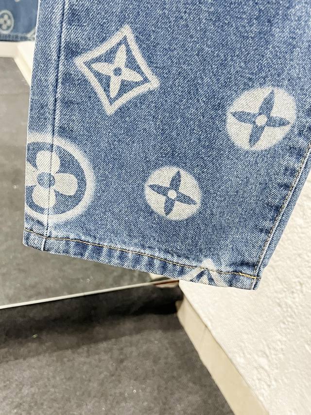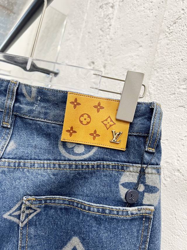 Style No.: H903 Louis Vuitton & Louis Vuitton LV Classic All-Over Logo Jeans Original sourced and developed with advanced pattern-making techniques. High-quality version using washed denim fabric with a special washing process and tie-dyeing steps. Multiple washes result in even denim texture and a flawless distressed finish. The process is extremely intricate, with each piece of fabric bearing the brand logo and all three labels. Color: Blue Size: M/L/XL/XL