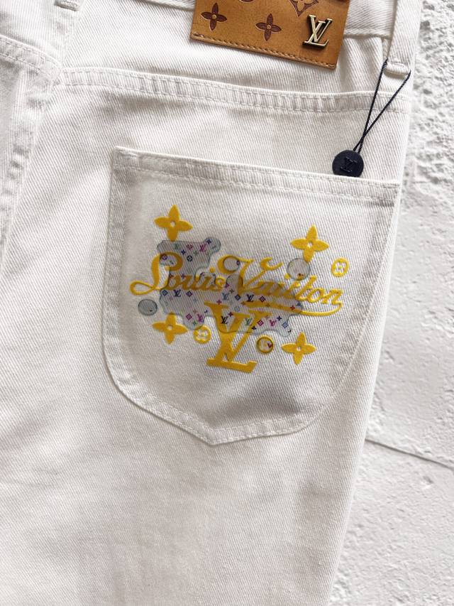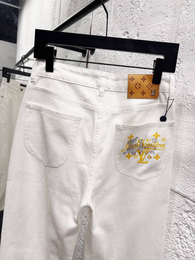 Style No.: H960 Louis Vuitton Ss25 Pure Cotton Washed Cartoon Print Jeans, Unisex, White. Top-tier quality. Different wash textures, very flattering for both slim and thick legs. The straight-leg, slim fit is very flattering and the perfect length is timeless. Easy to style, a wardrobe essential for various looks! The fabric is firm yet soft against the skin, and the washing process is superb. A must-have! Complete with hangtag, label, and tags. Color: White. Sizes: 28, 30, 32, 34, 36.