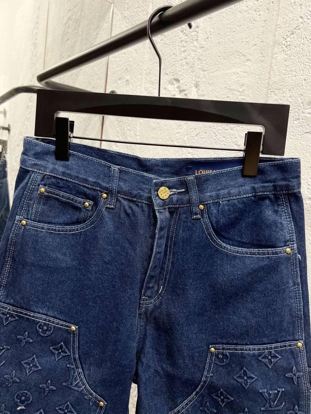 Style No.: H971 Louis Vuitton & Louis Vuitton embossed denim cargo shorts. Fabric: High-density, coarse left-hand twill denim. Embossing is done using four separate molds, one-to-one embossing process. Imported glue is injected to ensure the pattern is firm and three-dimensional, and will not deform after washing. Unisex. Color: Blue. Size: 30 32 34 36 38 40.