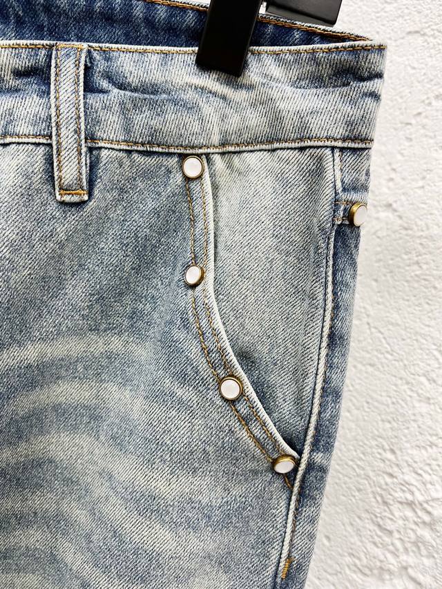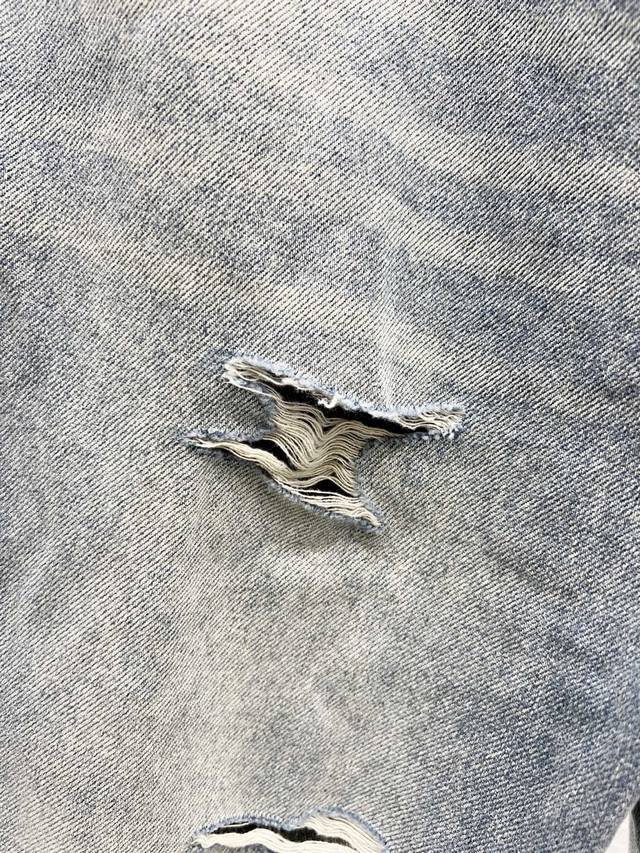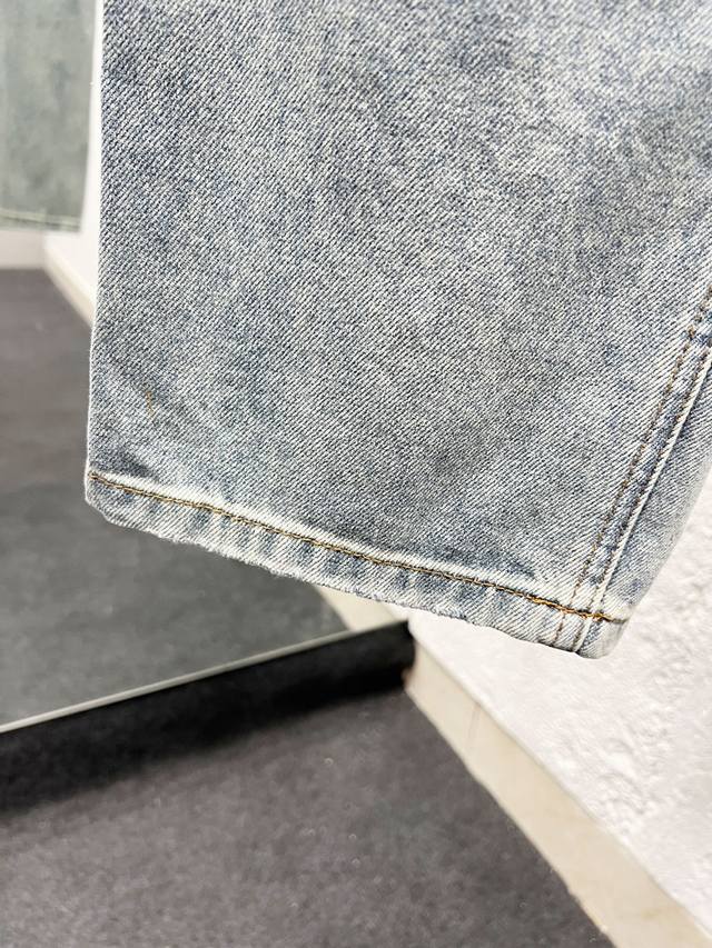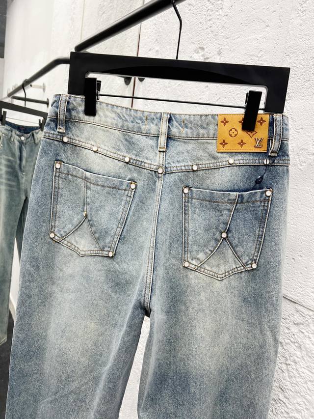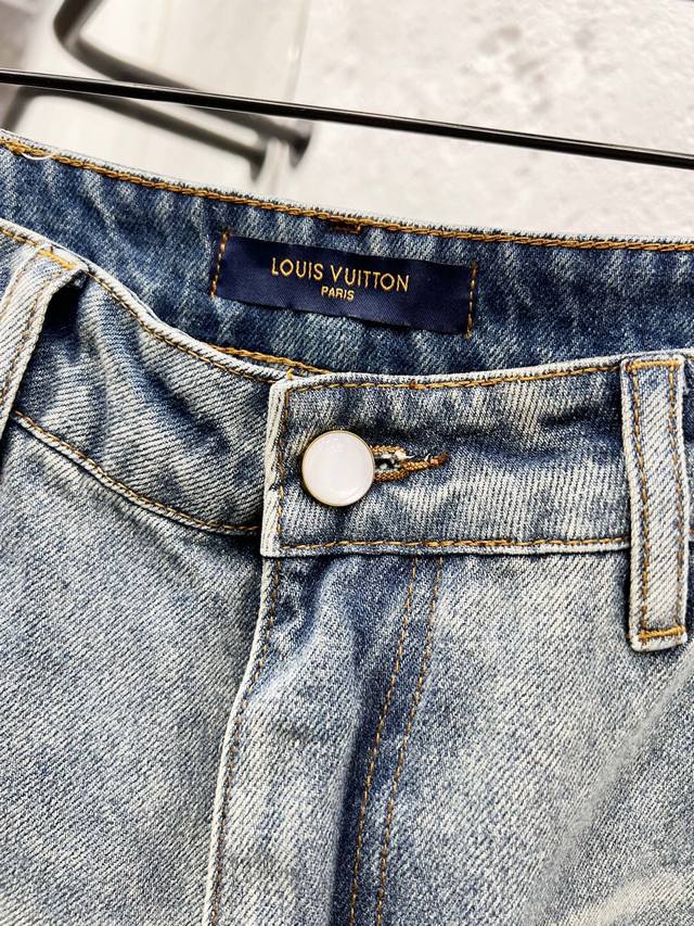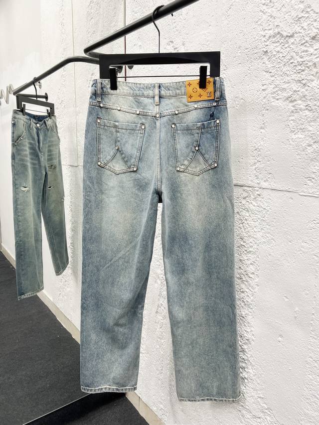 Style No.: H976 Louis Vuitton 25Ss Ripped Retro Mid-Rise Straight Leg Logo Jeans. Top-tier quality. Different washes create a flattering look for both slim and thick legs. The straight-leg, slim fit is incredibly flattering and the timeless length makes it easy to style. A wardrobe essential! The fabric is both structured and soft against the skin, and the washing process is superb. A must-have! Complete with all tags, labels, and tags. Color: Blue. Sizes: 30, 32, 34, 36.