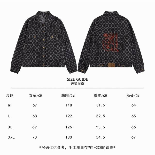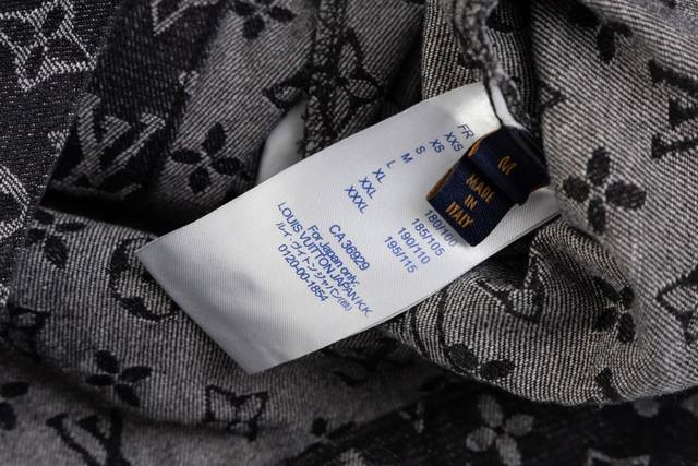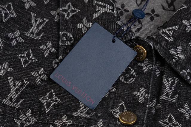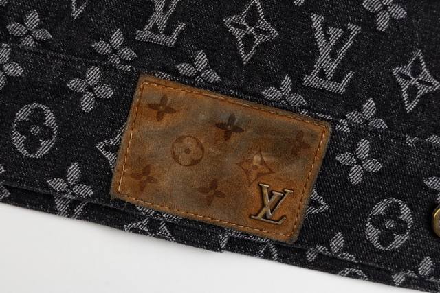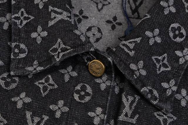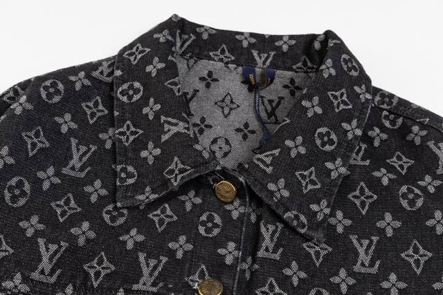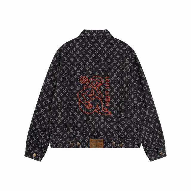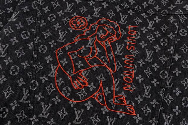 Louis Vuitton taillight portrait embroidered jacquard denim jacket. Sulfurized black jacquard fabric. Back panel embroidered with a figure portrait. Fermented and bleached. Nostalgic sewn leather patch. Custom hardware and logo registration. Heavy-duty hardware accessories.