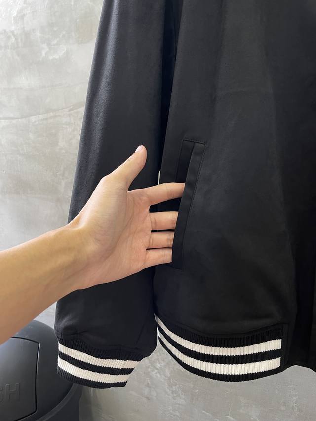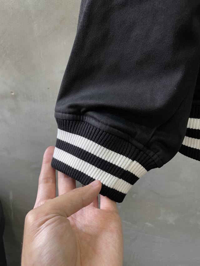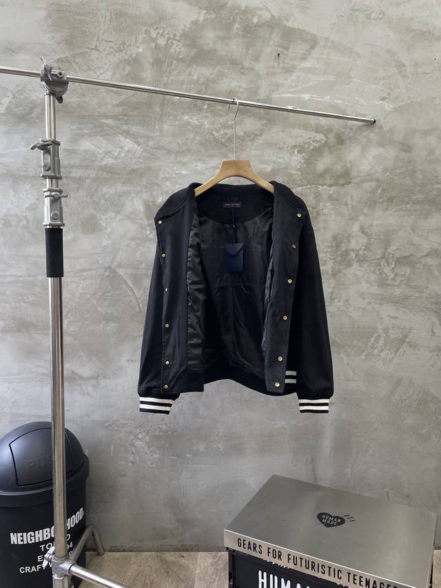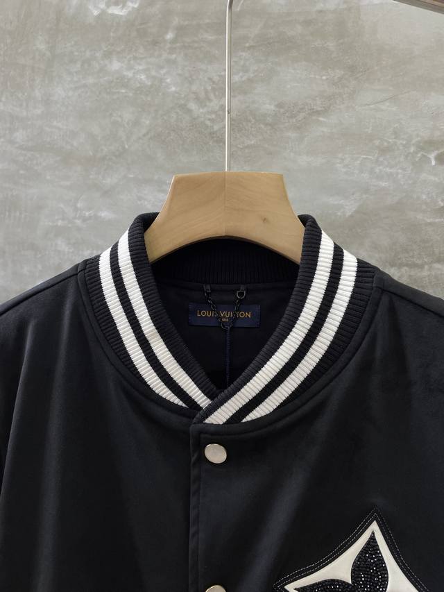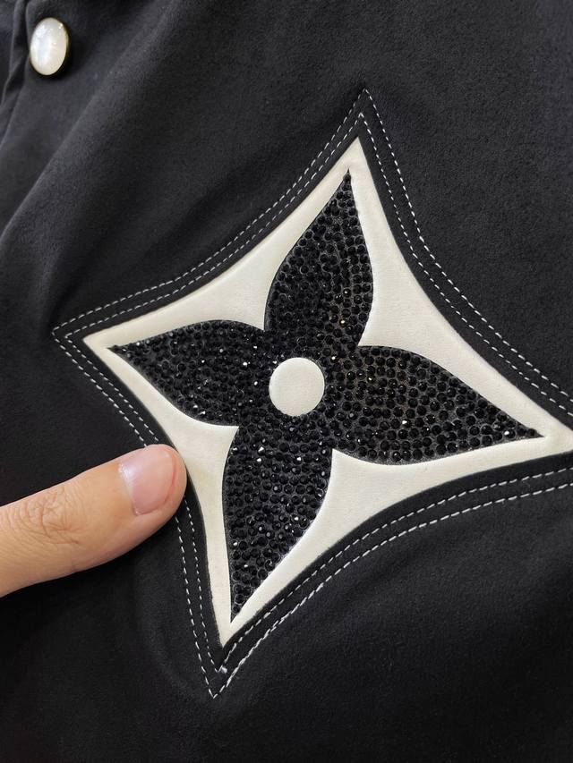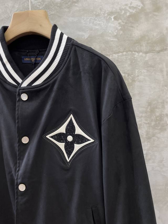 Style No. #S573 Louis Vuitton 25Ss Lv Four-Leaf Clover Rhinestone Suede Baseball Jacket, Official Website Synchronized. Made with custom imported suede lining, featuring a high-end Sumi-Mex silk fabric, original designer factory, professional pattern maker, laser 3D cutting to replicate the original design. The chest patch is made with an independent opening machine, cut and stitched with a layer of calfskin sole, featuring rhinestone and crystal hot-fix rhinestone inlay. Custom-made original genuine leather label with custom horizontal flat-base ribbed thread. Original pearl-finish snap fasteners and chain, consistent with the original design. Washed main label, brand zipper, resealable pocket, brand logo, moisture-proof paper. Color: Black. Sizes: Xs, S, M, L.