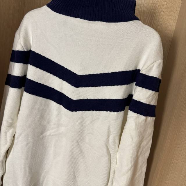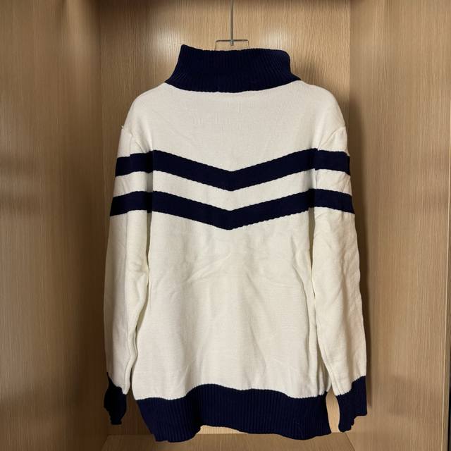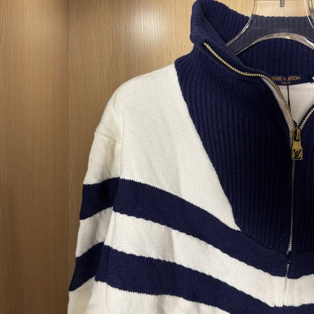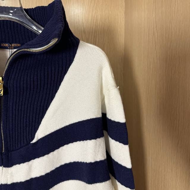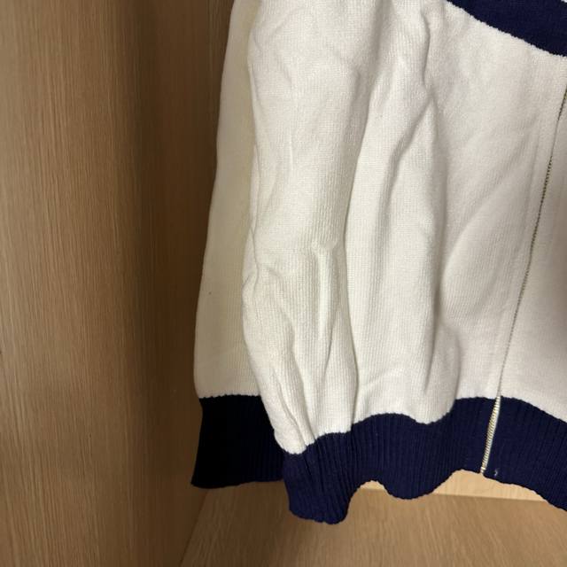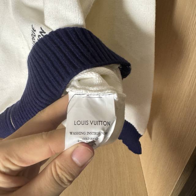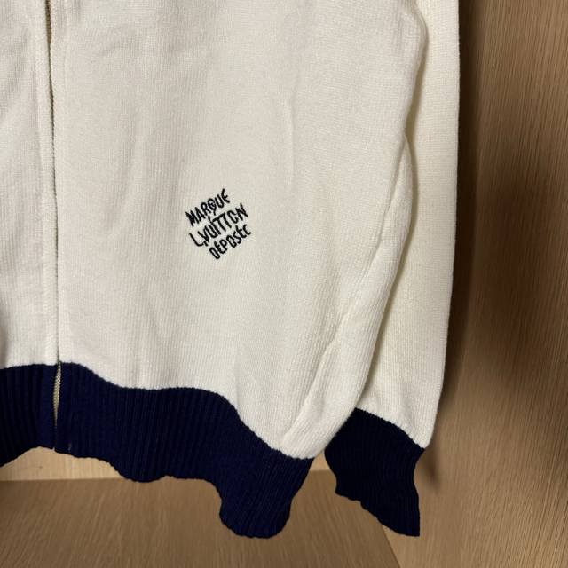 Style No. T14 Ddd Lv Louis Color Block College Line Embroidered Knit Cardigan Ddd The yarn used is 240-count 100% combed cotton, knitted on a 14-needle computerized machine, with a solid color sesame base, taking about 160 minutes. The blue and white stripes are made with a brushed finish, taking about 70 minutes to knit. During sewing, the hem ribbing and cuff ribbing need to be double-stitched. The collar seam is covered and not exposed, requiring two stitches. The bottom seam and the body seam are not on the same line, requiring circular sewing when attaching the sleeves, resulting in a long sewing time. After embroidery, the blue and white stripes and zipper are sewn on. Special attention must be paid to the straightness of the stripes during flat sewing, as they are very easy to become crooked. The zipper is covered with the inner seam, and the collar is high, making it difficult to sew. The entire processing and production process involves too many steps, and the white wool is very easy to get dirty, increasing the finishing time and the defect rate. DDD
