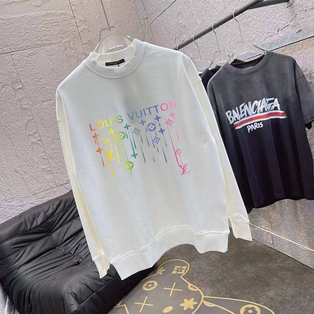 1V*Louis Vuitton autumn and winter new personalized letter logo printing custom fabric 400g double-strand terry 1 1 custom thread round neck sweatshirt unisex