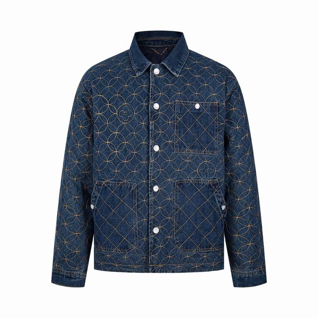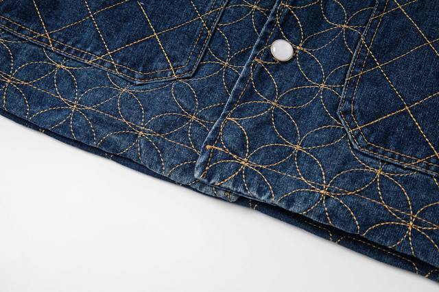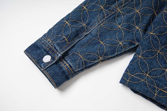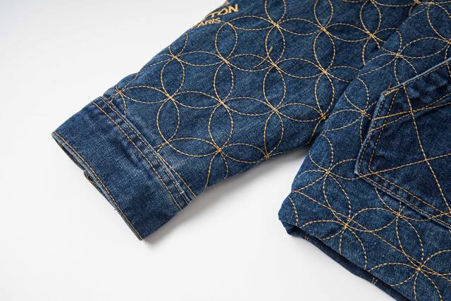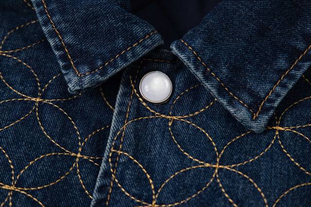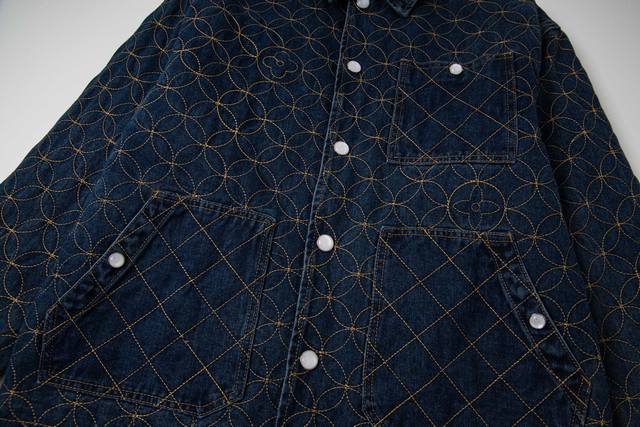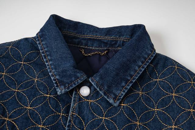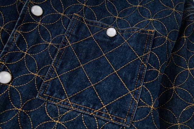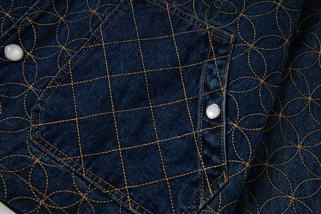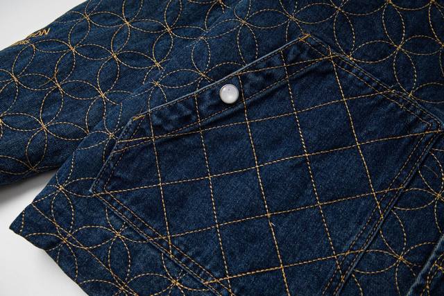 . Originally purchased for 29,600, this Nigo collaboration is part of the collection. Made from custom-made, original cotton twill denim, this jacket features embroidered patterned stitching. The all-over embroidery technique, characterized by meticulously crafted, densely and evenly woven patterns or designs, similar in size to grains of rice, creates a full, delicate visual effect. The stitching and thread used in this embroidery form tiny, rice-like units, which are closely arranged to create the overall pattern. The intricate craftsmanship creates an artistic visual experience. The inner cover is joined to the cotton fabric, a meticulous process that mirrors the original. The flat tack and cuff buttons feature clear and detailed engraving, and the eco-friendly bronze electroplated zipper closure is custom-made with all new trimmings. The metal flat nails and threshold buttons are clearly engraved and delicate, and the overall texture is high-end and fashionable. It is an unrepeatable work of art. It is suitable for matching with jeans in the same series. It is an exclusive first shipment.
