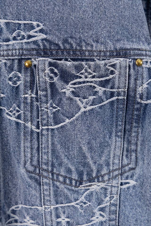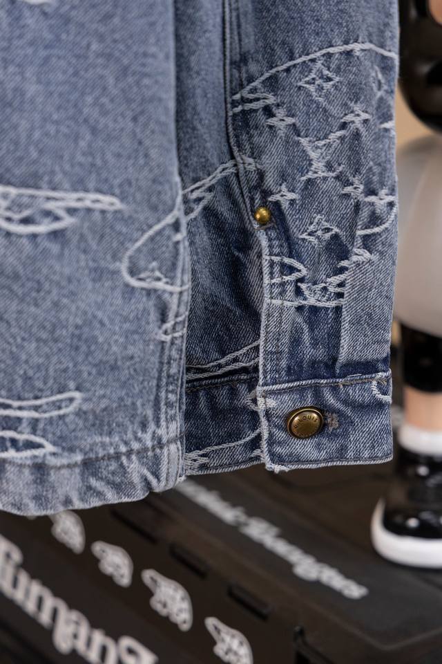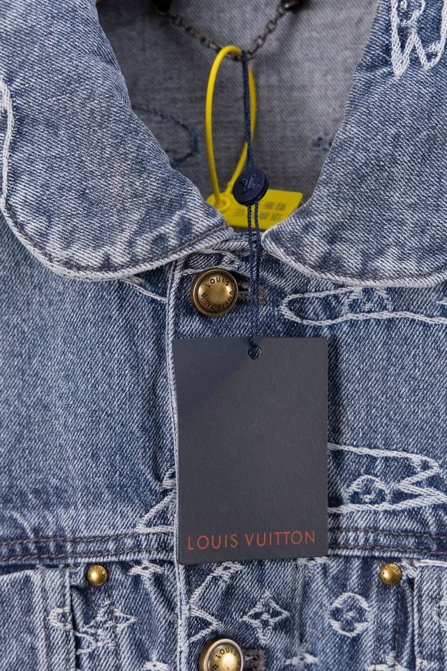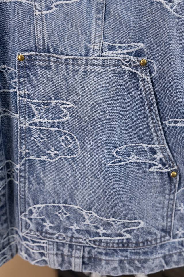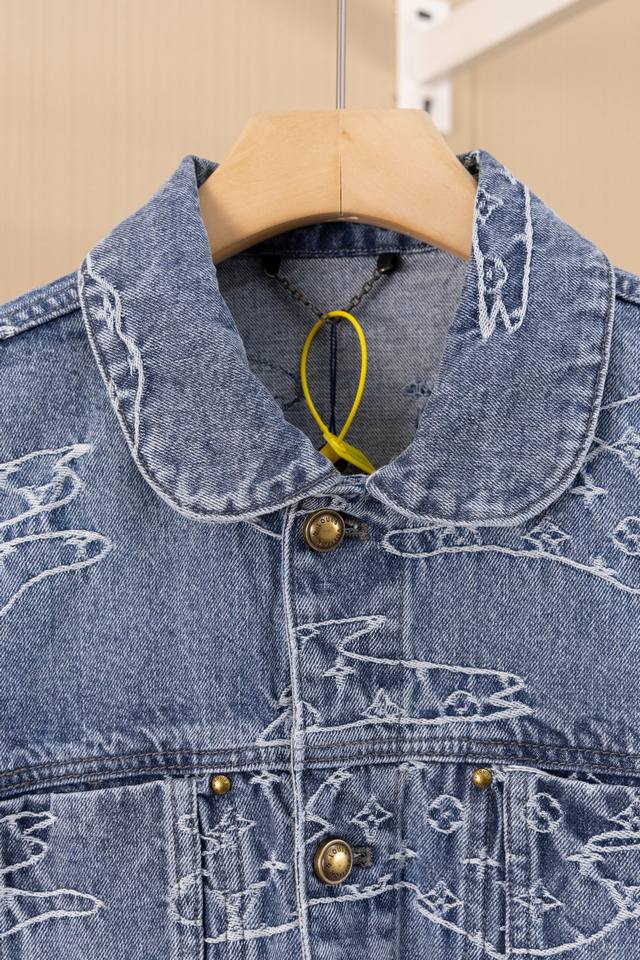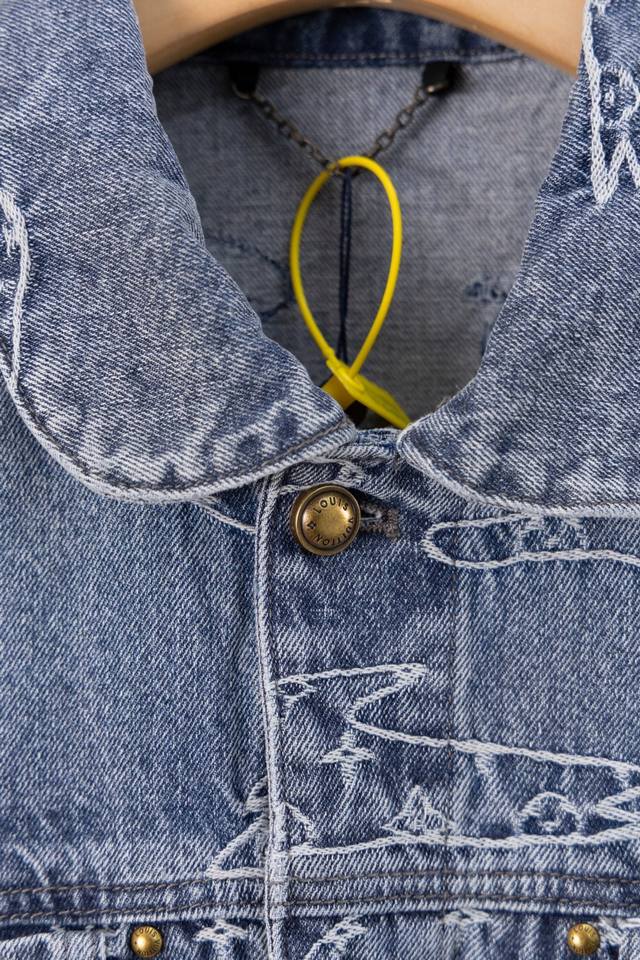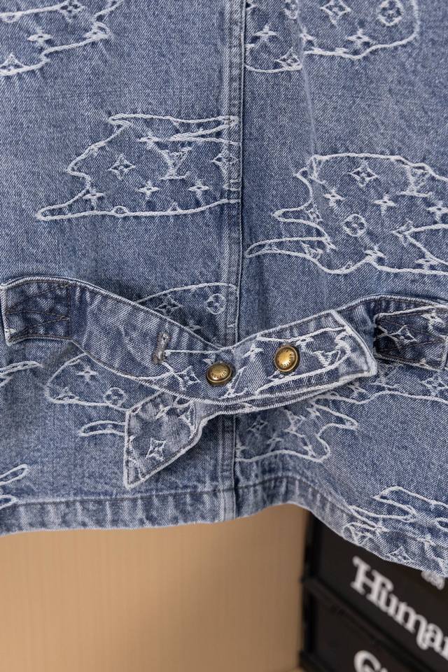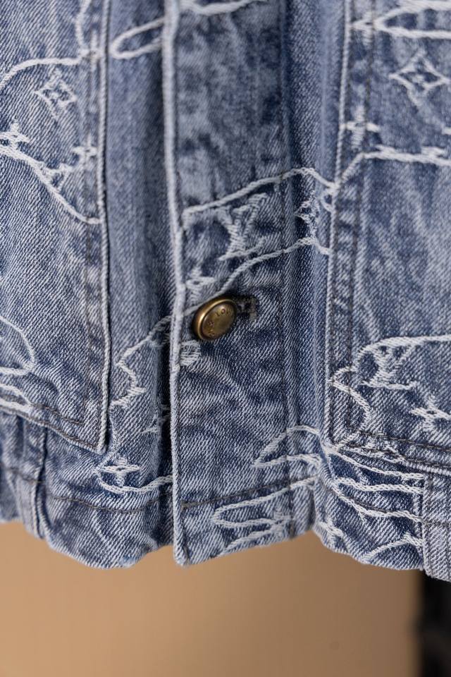 Lv25Ss denim suit. Original design purchased for 15,600 RMB, custom-made with a one-month turnaround. Bamboo cotton denim, original design, gradient mosaic plaid, and lettering jacquard pattern, 1:1 replica, pearl hardware, and laser-engraved logo. Minimum order quantity: 60,000 pieces. Each pearl button costs 40 RMB. Perfectly detailed, the garment undergoes enzyme soaking and washing, and the buttons are hand-attached. Machine-attached buttons are not permitted due to the pearl material. Machine-attached buttons have a 40% scrap rate. The all-over mosaic plaid is cut with fixed black and white checkerboard patterns.