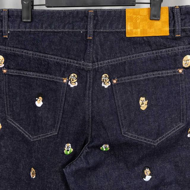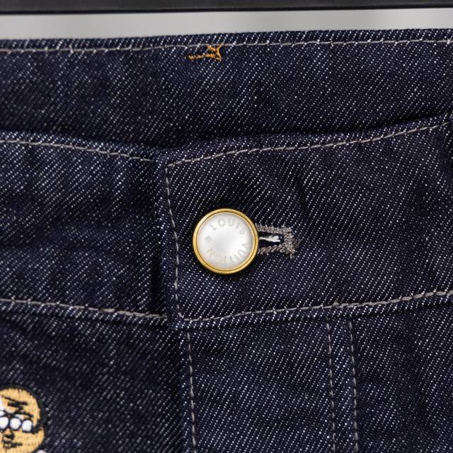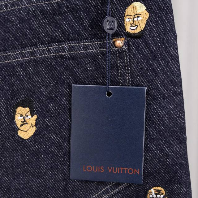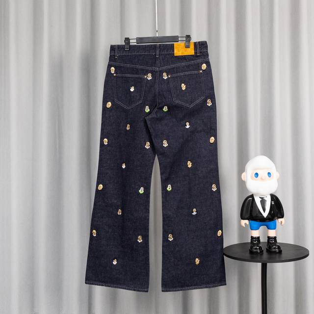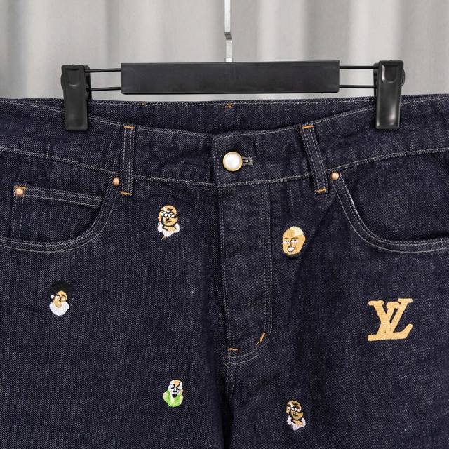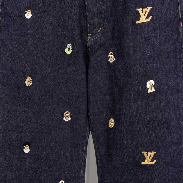 Top-tier version, different from standard version. Louis Vuitton SS24 Pharrell Williams collaboration series single-breasted loose-fitting casual denim jacket with embroidered lettering and logo. 2. Louis Vuitton SS24 Pharrell Williams collaboration series flared jeans with embroidered logo and lettering. 3. Louis Vuitton Trainer white cement-look sneakers. 4. Louis Vuitton logo design glass pearl necklace (white). 5. Louis Vuitton Speedy25 classic monogram.