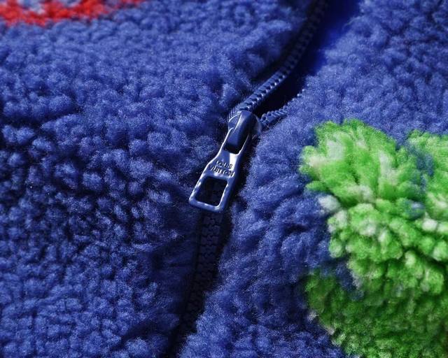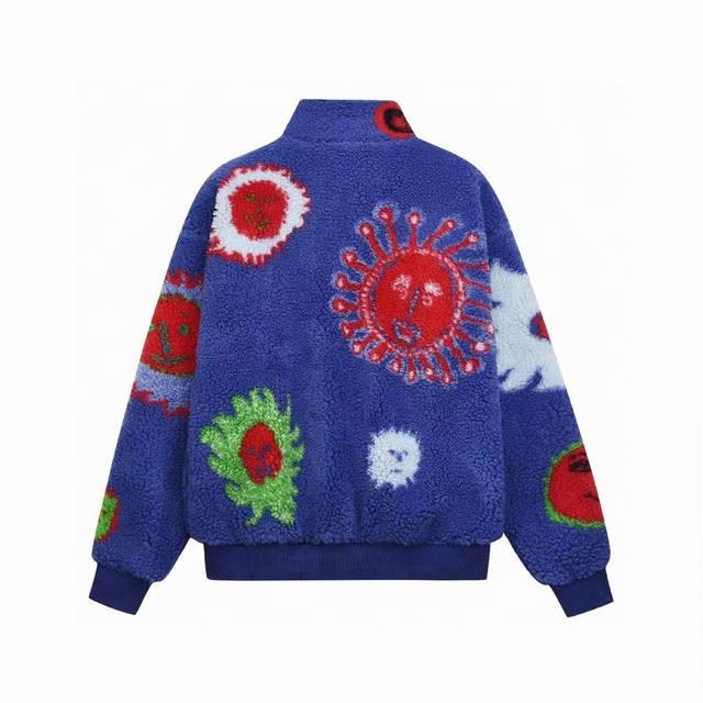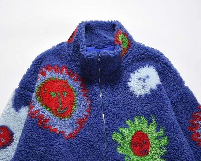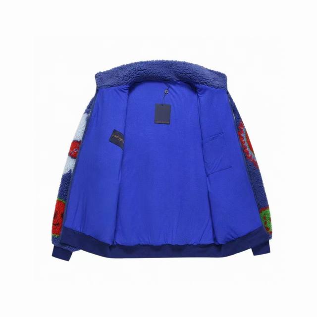 Upgraded suede long-sleeved stand-collar jacket with bright color patterns on the front and back, featuring all-cotton blue lining and classic metal logo tag at the hem