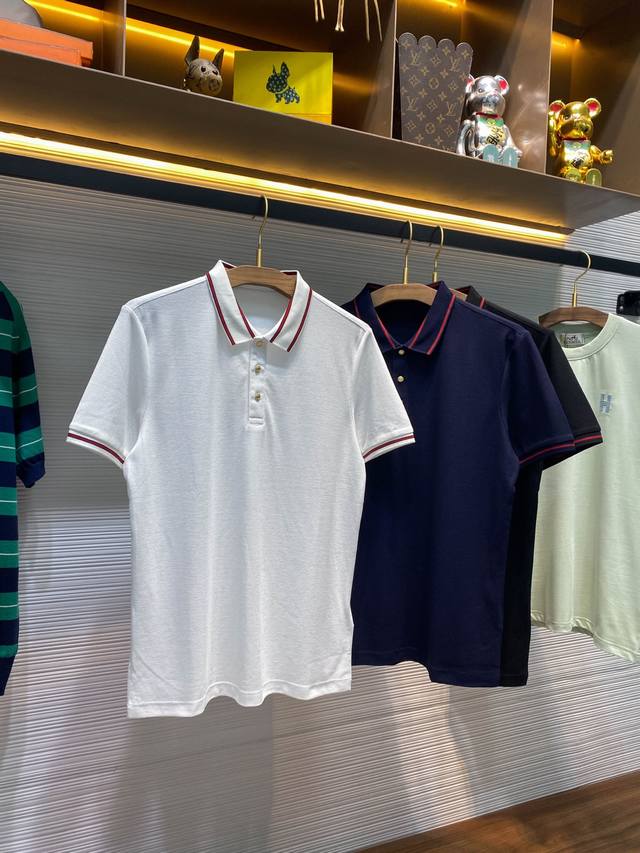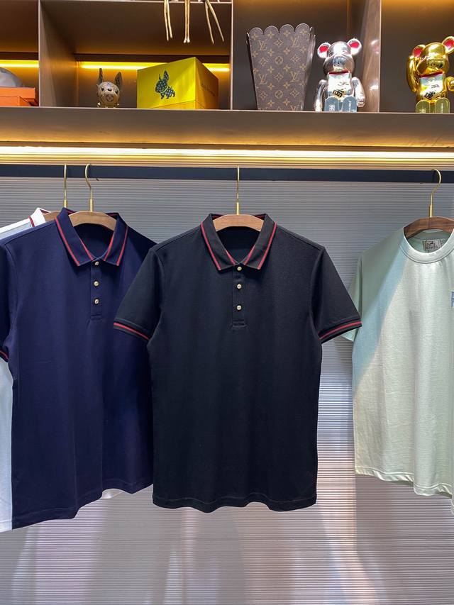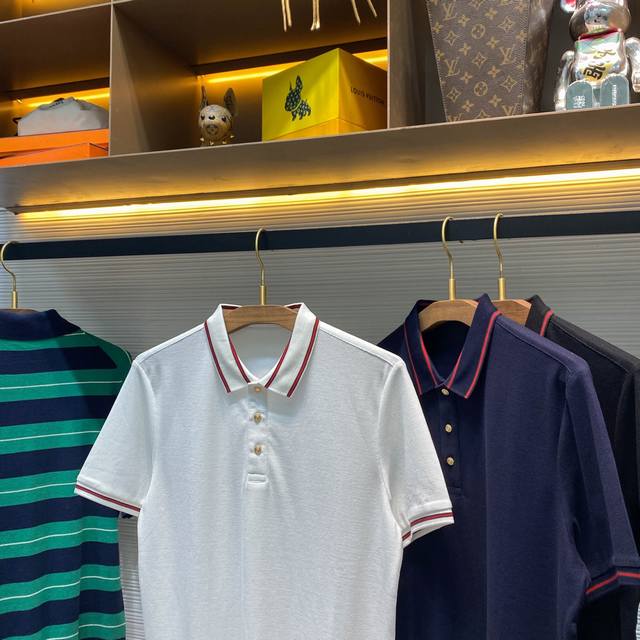 A26-Gu25Ss Spring and summer new mesh beaded cotton cloth contrast lapel short tee, men's Gg gold button placket opening and closing business casual short-sleeved Polo shirt! The trading company channel is rare, leading the official website for sale! A fashionable item that combines classic and luxury, with its unique charm to attract you who pursue quality life!