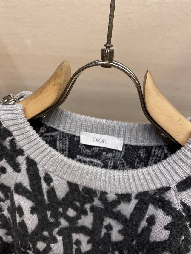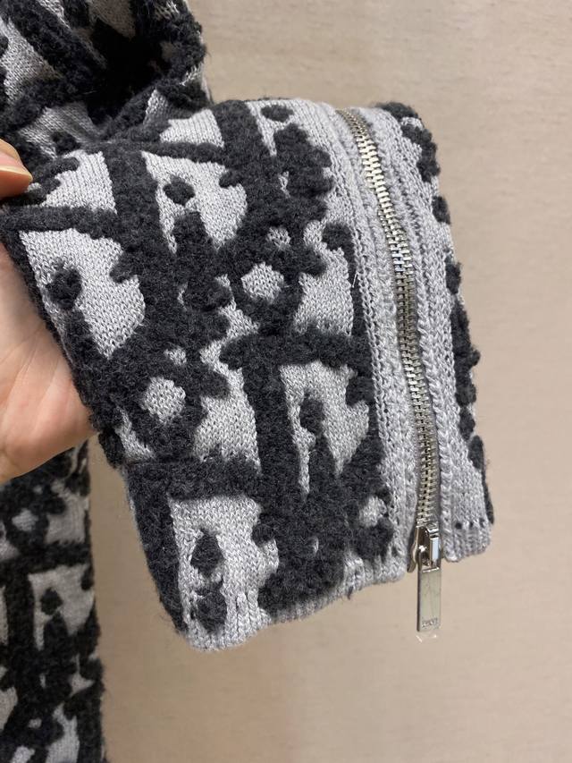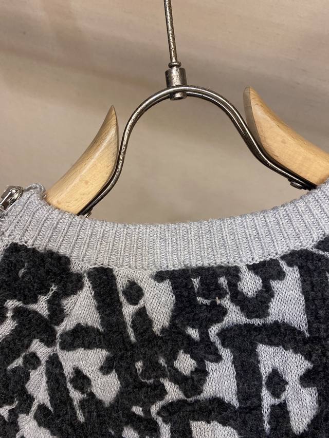 Dior Wool Blend Jacquard Sweater This sweater is crafted from a white sheep and wool blend jacquard fabric, accented with a raised classic light green Oblique print throughout. Zipper closures on the sleeves add a touch of modern style. Color: Gray Sizes: S-XL
