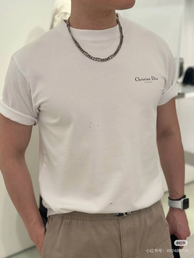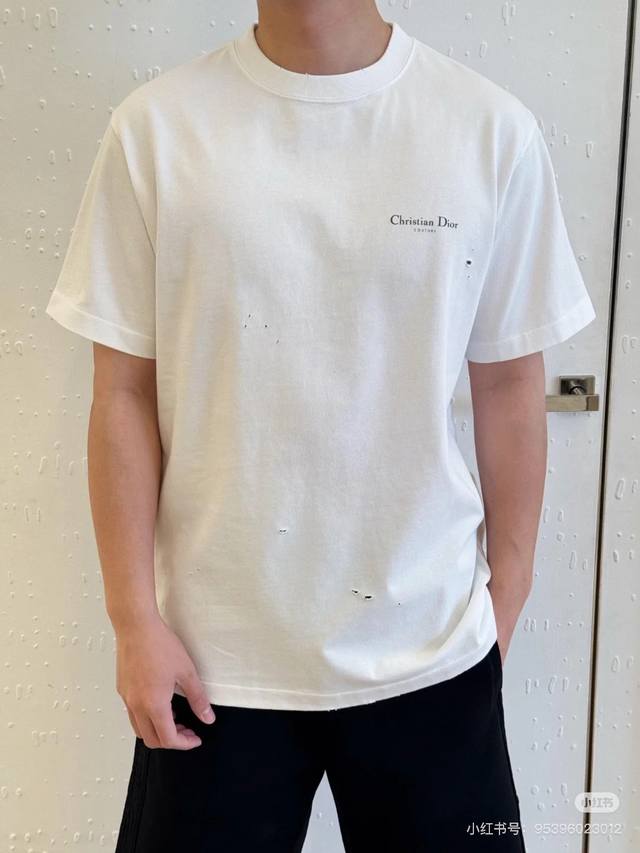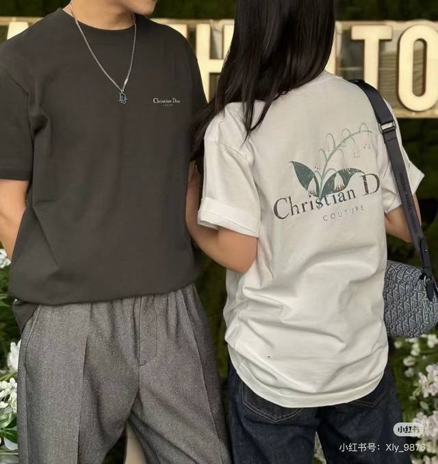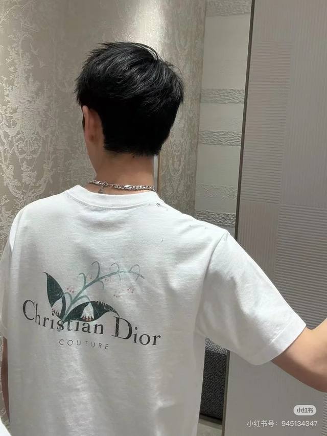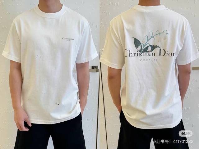 Dior's new 2025 short-sleeved T-shirt with a lily-of-the-valley print on the back. This unisex loose-fitting, ripped top features a Christian Dior Couture lily-of-the-valley print. This new addition to the Fall 2025 men's collection adds an original touch to a classic style. Crafted from black distressed cotton jersey, it features the Christian Dior Couture logo print on the back and lily-of-the-valley flowers, a tribute to Mr. Dior's love of flowers. The comfortable silhouette pairs easily with any pair of jeans. Colors: Black and White. Sizes: S-XXL