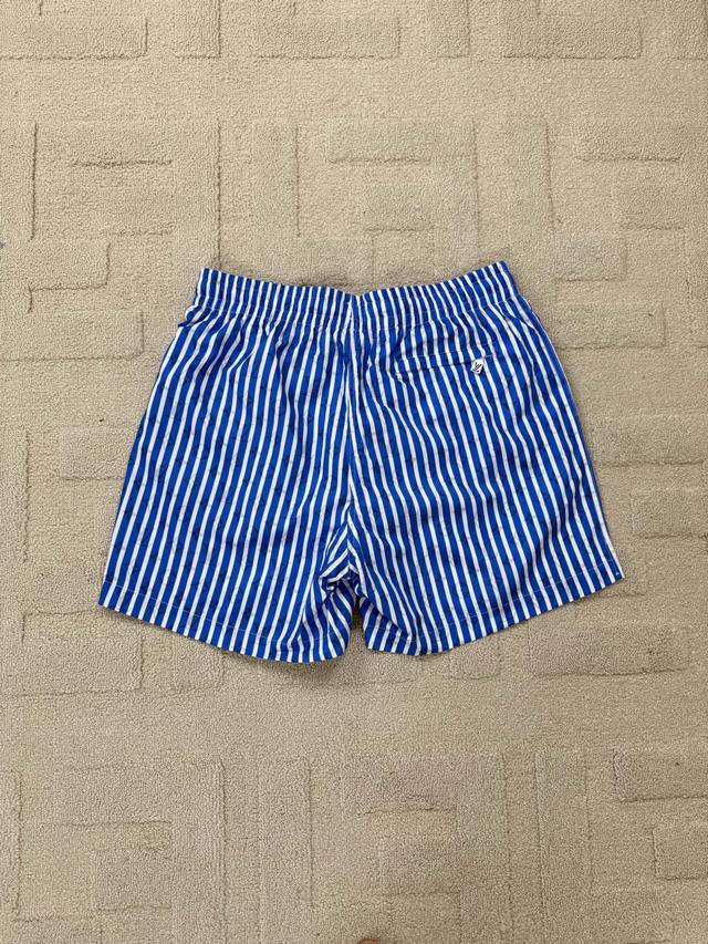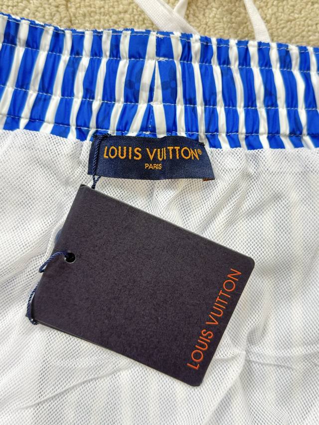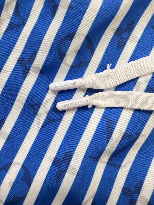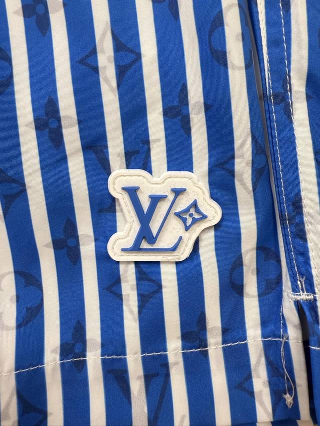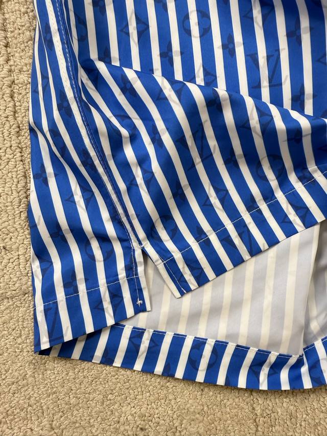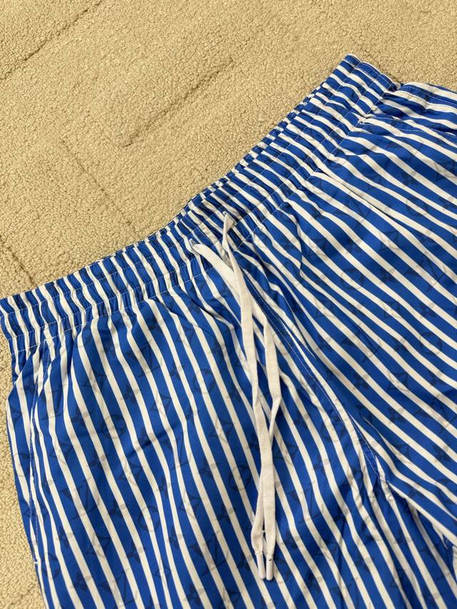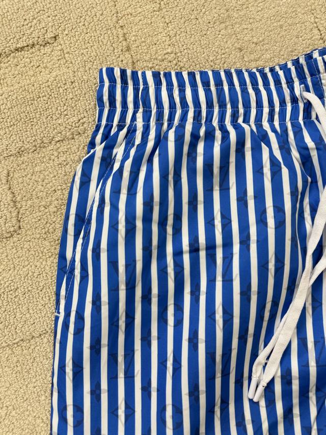 Flat-Detailed Lv Blue Striped Beach Shorts. These beach shorts feature an all-ov
