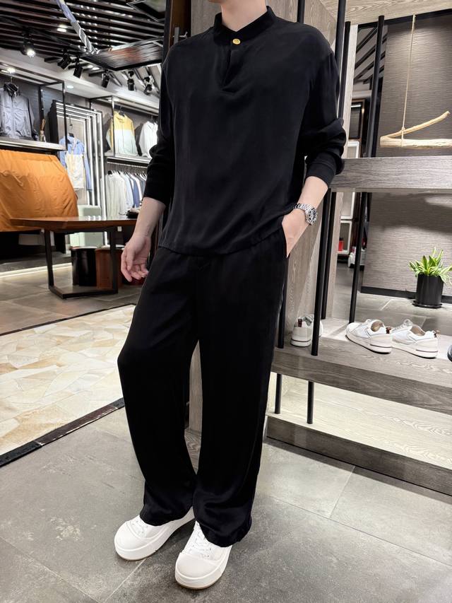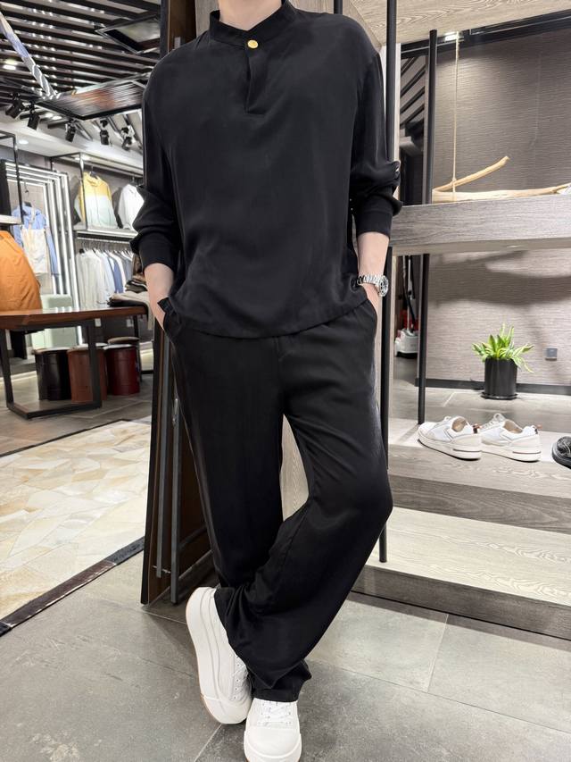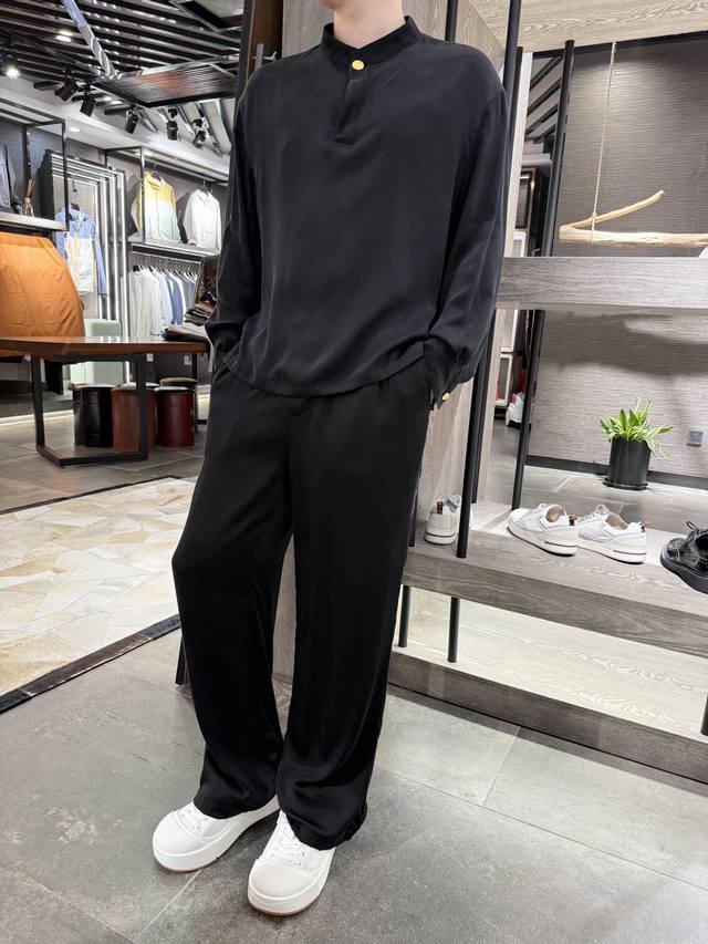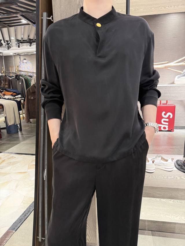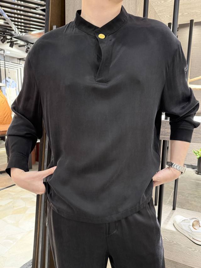 Givenchy - New Chinese style stand-up collar cuprammonium long-sleeved shirt Cuprammonium, also known as breathable fiber, can maintain comfortable humidity and temperature inside the clothes all year round. Two-button design with two ways to wear. Small stand-up collar with Customized Chinese style gold button design. The fabric is made of 55% cuprammonium and 45% rayon with the following characteristics: Water absorption and breathability: This fabric shows excellent water absorption and can effectively absorb sweat. Combined with its excellent breathability, it makes the wearer particularly suitable for summer, keeping cool while avoiding stuffiness and dampness. Soft and comfortable: The fabric is soft and smooth, and is extremely comfortable to wear close to the skin. It feels delicate when in contact with the skin and has no foreign matter infection. Excellent color performance: Copper Spandex fabric has excellent dyeing and coloring effects, and can be dyed with almost any color, and the color is durable. Anti-static: The fabric has strong anti-static ability, which reduces the discomfort of wrapping and sticking to the skin, ensuring comfortable wearing. Easy to clean: It is easy to clean, and there is little detergent residue after washing, which is very suitable for use as underwear. Environmental characteristics: Copper ammonia silk is made of wood pulp and cotton linter pulp. It is environmentally friendly and renewable. It can be naturally degraded in the soil and is environmentally friendly. Strong moisture absorption and release: Copper ammonia silk has excellent moisture absorption and release properties, and can maintain a comfortable humidity and temperature in the clothes all year round. It can be called a "breathing fiber" Size: 48-56 Model is 180cm 140cm wearing size 50, with Hong Kong Lane Crawford gift box packaging
