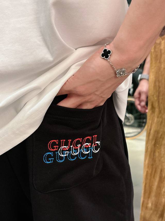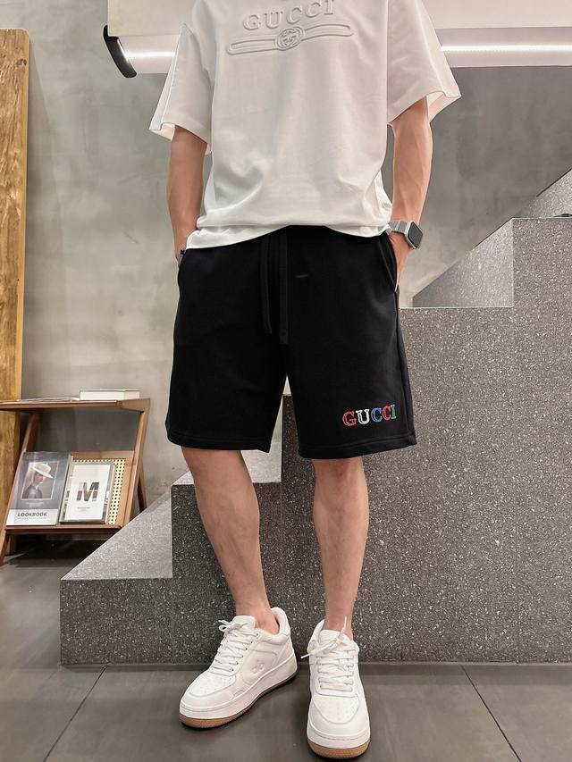 Gucc*I 25Ss new summer casual shorts, high-end custom-made large wool loop pure cotton 430G fabric. Highly breathable, elastic and comfortable, impeccable details, top-grade accessories, original Logo design concept, delicate and soft to the touch! The upper body shape is great!