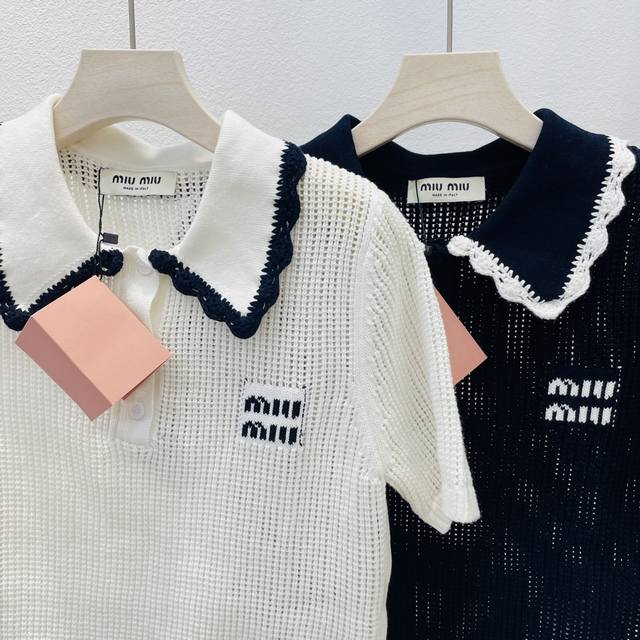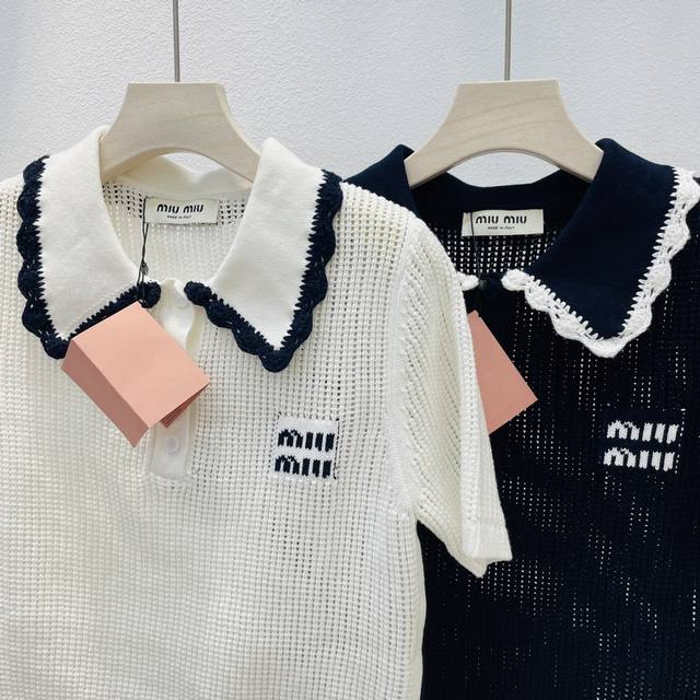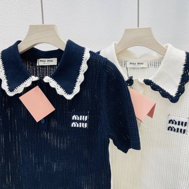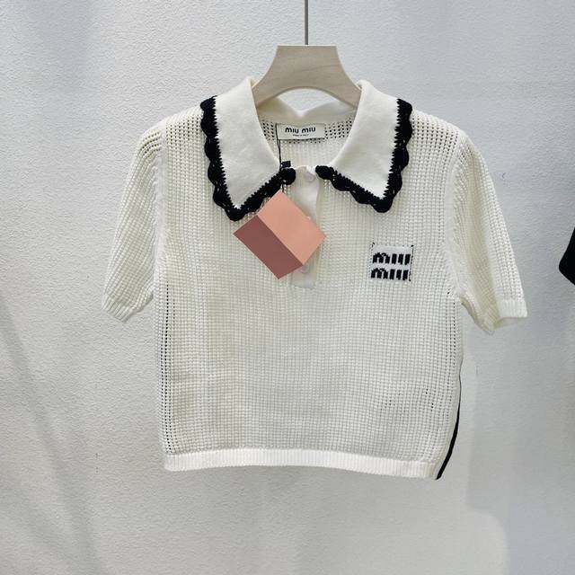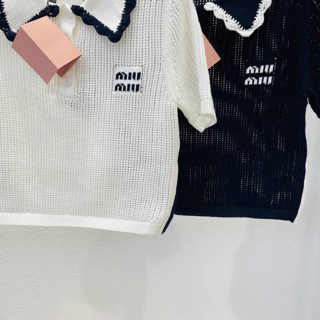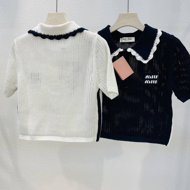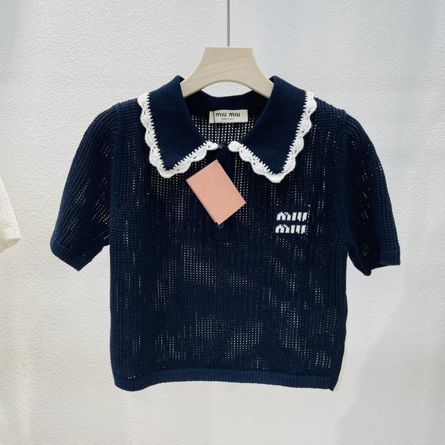 Miumiu new blue and white color matching doll collar short-sleeved knitted top 2 colors and three sizes Sml spot supply