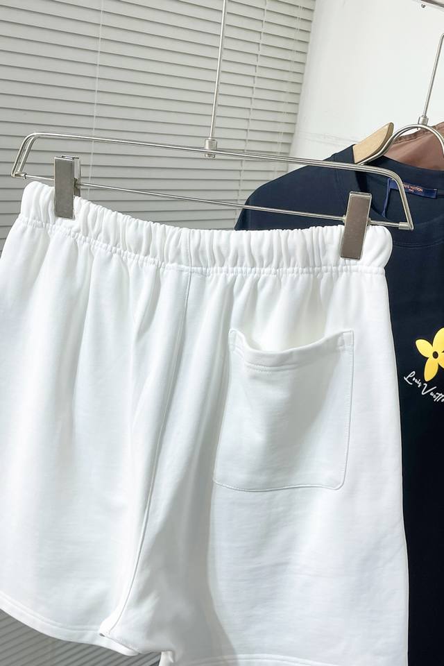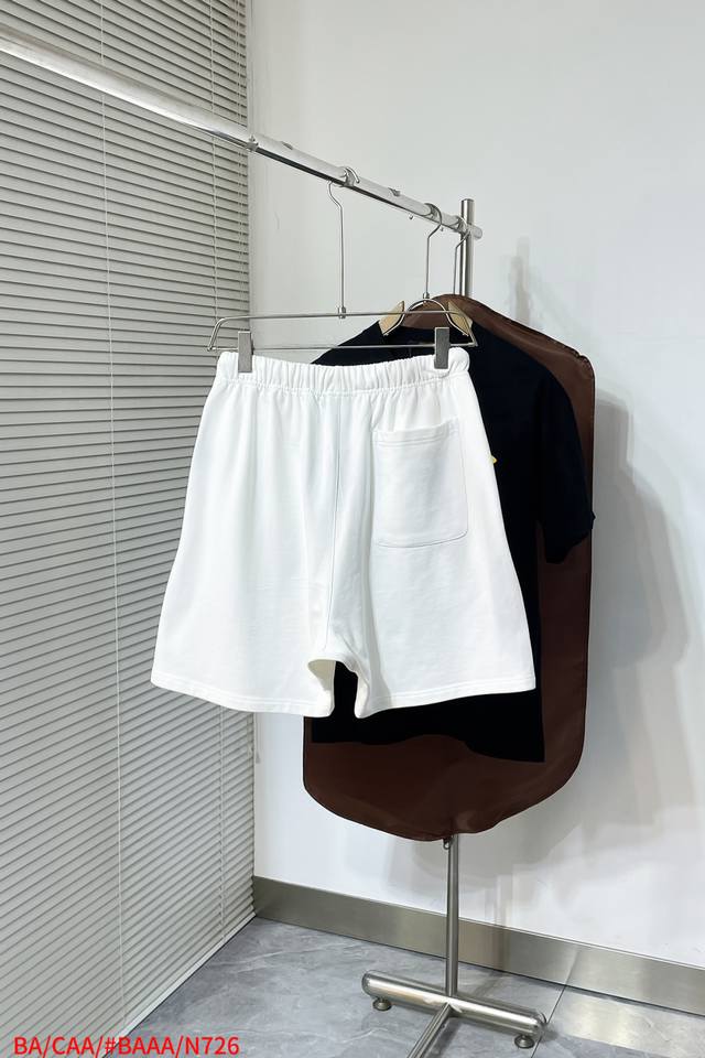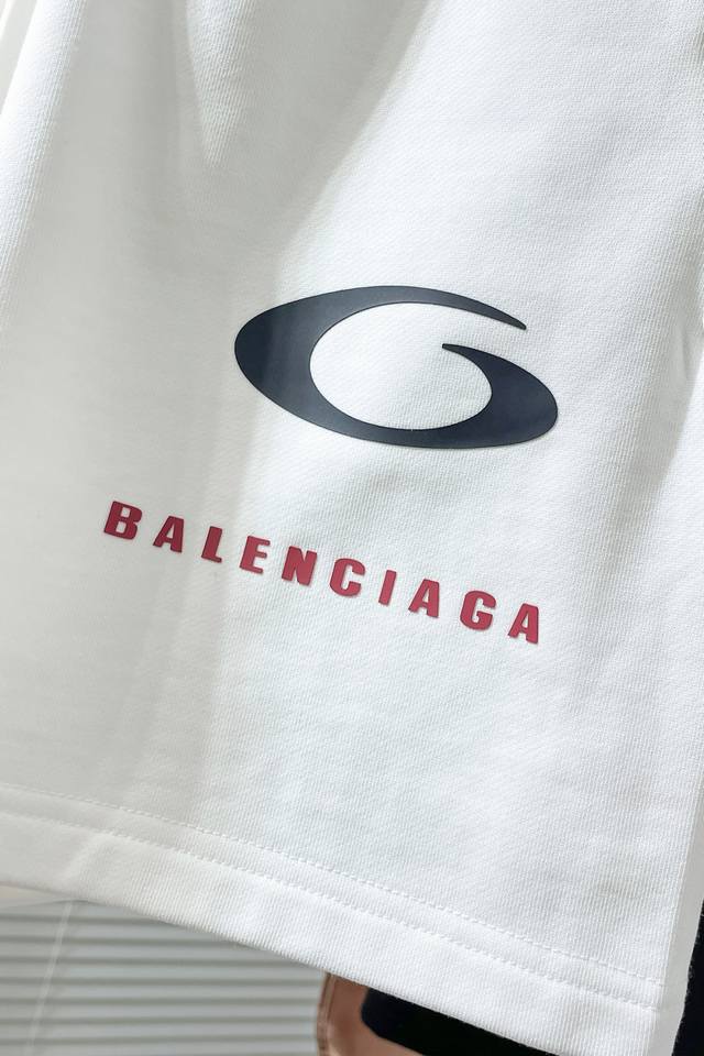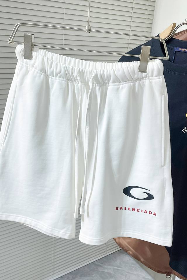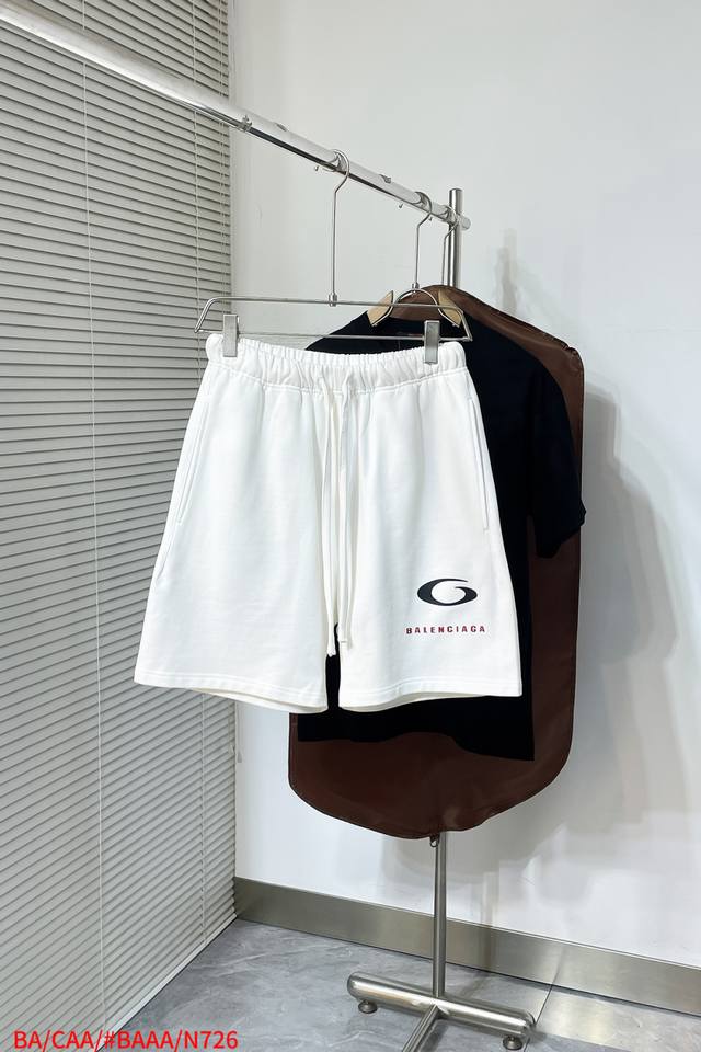 N726 Ba Balenciaga 2025 new drawstring shorts. Simple elastic waistband design. Red and black brand logo in the lower right corner. Showcasing understated luxury. Perfect for summer leisure or sporty styles. Combining design and practicality. 420g heavyweight fabric, 100% cotton. Black and white. Sizes M-3Xl.