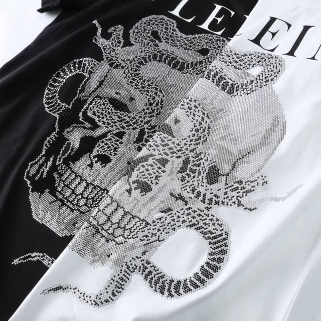selected customers import 80 3 strands 100% cotton plain knitted fabric, the fabric feels light and smooth, and the touch is super soft and skin-friendly. The upper body brings you the ultimate comfortable and enjoyable wearing experience! The iconic skull head + zodiac snake logo pattern hot diamond decoration on the front of the body shows a unique fashion trend, and the overall style is very individual! The metal leather label on the back and the embroidered ribbon label on the side further confirm its high-end status! Casual fit cut, handsome hot brick skull cool design, simple but trendy! Black and white, two colors! Item No.: 3576# Size: 48 M-56 3Xl
