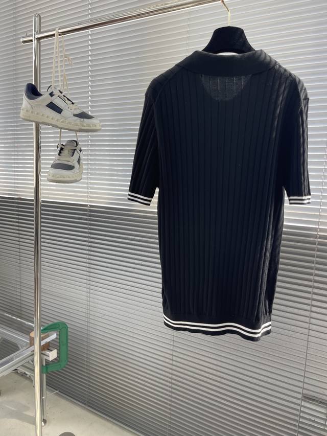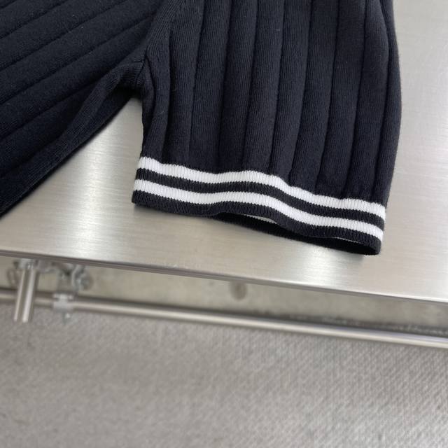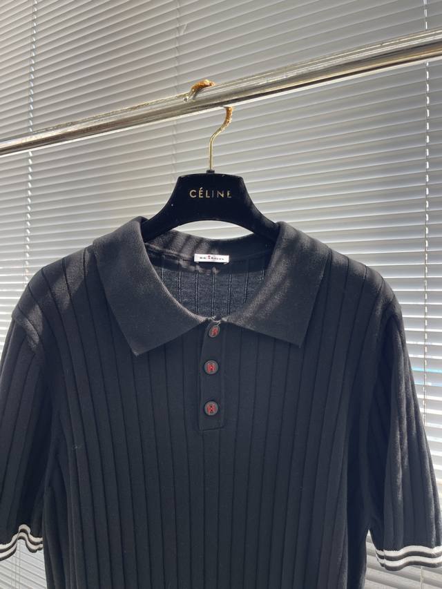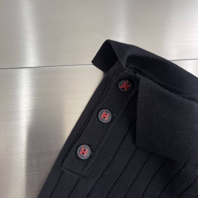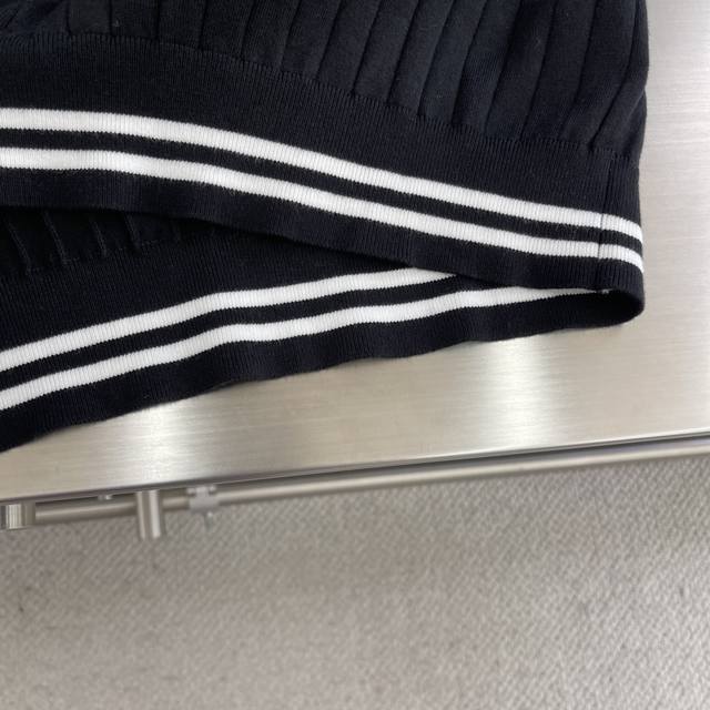 A knitted sweater with a full sense of design, available in black and khaki. It adopts vertical stripe knitting technology, the cuffs are decorated with classic white stripes, and the collar is matched with three black buttons with red patterns, and the details are exquisite.