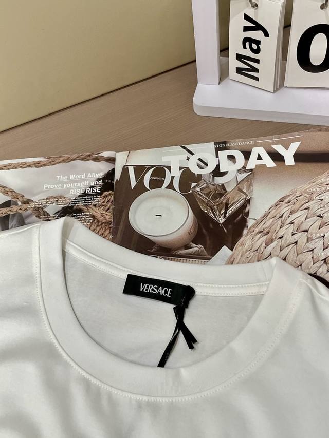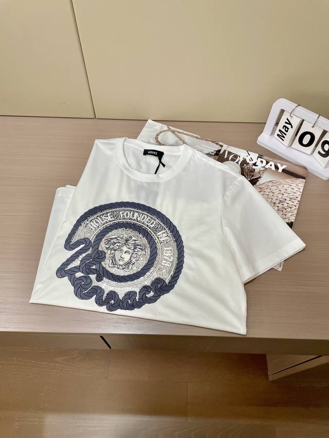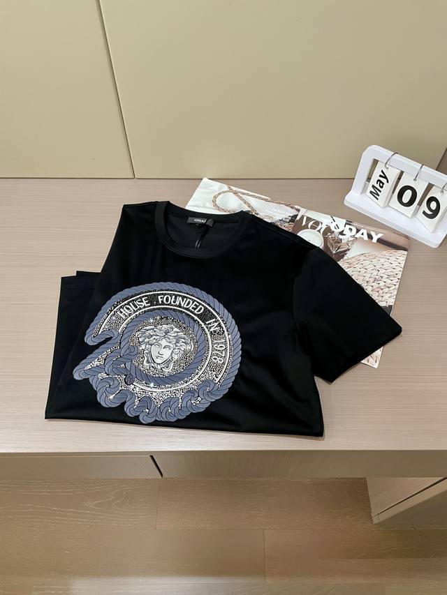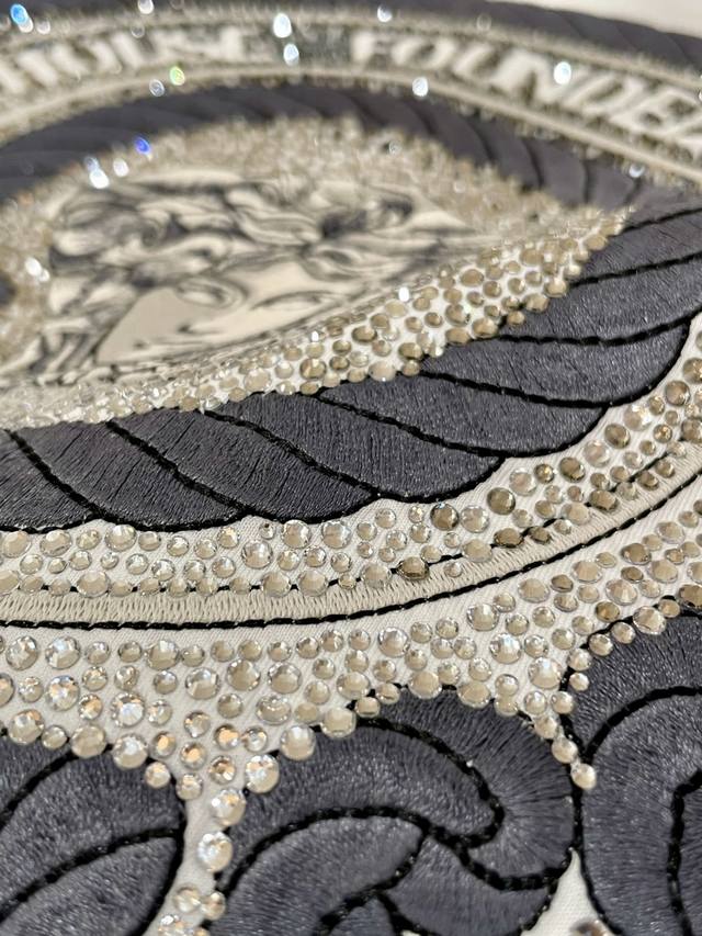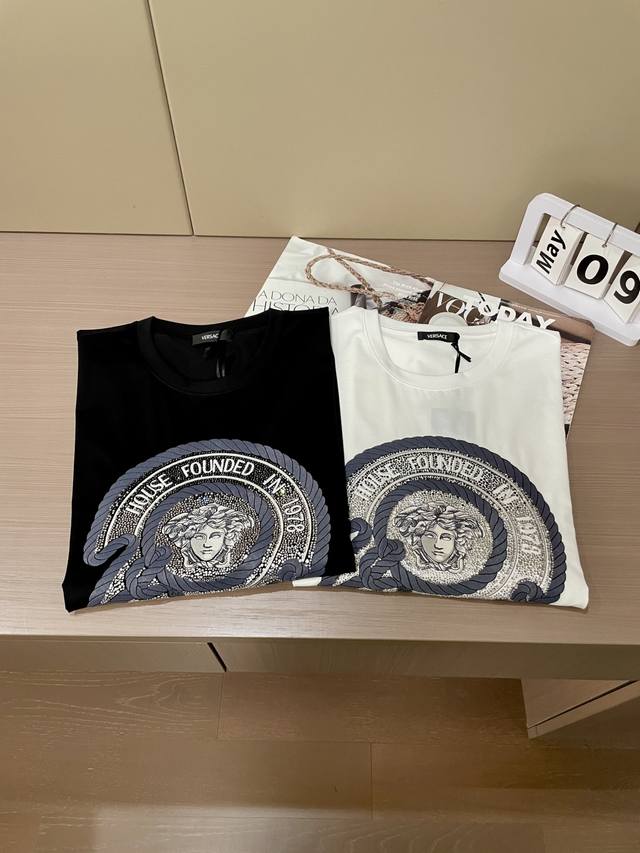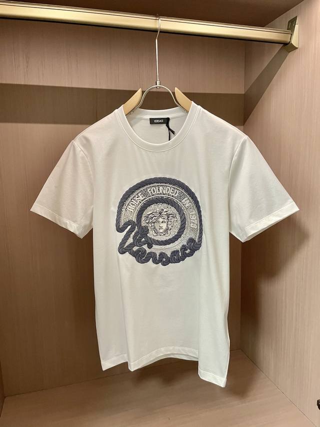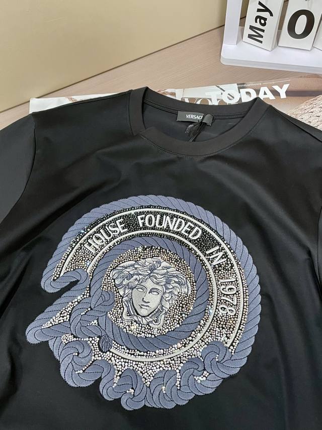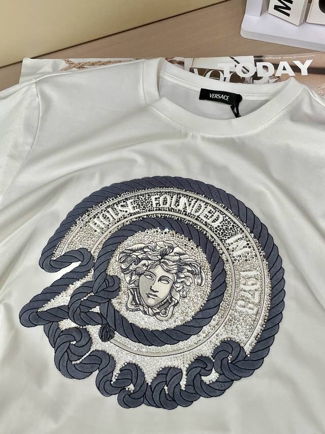 Versace 2025 Spring/Summer new product heavy-duty 10,000-needle embroidery and Swarovski crystal inlaid Medusa short-sleeved T-shirt; customized 100-count double-strand mercerized long-staple cotton fabric, comfortable, soft and delicate! Very suitable fabric for summer, with a round Medusa 10,000-needle embroidery and Swarovski crystal diamond inlaid pattern on the chest, it can be called a high-end product with a global luxury brand image, and it does have a unique design style! In line with modern aesthetic concepts!