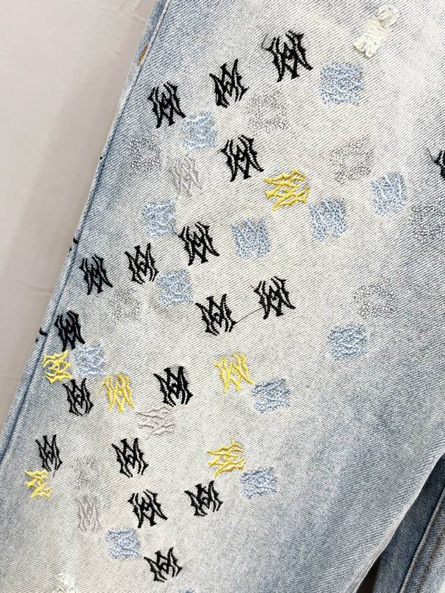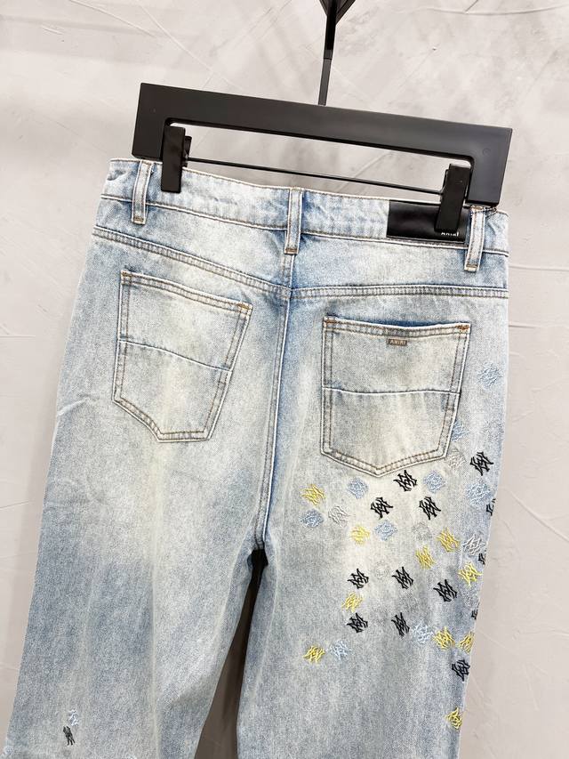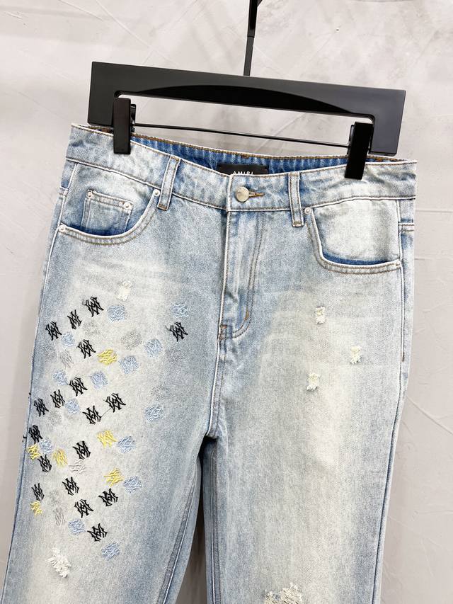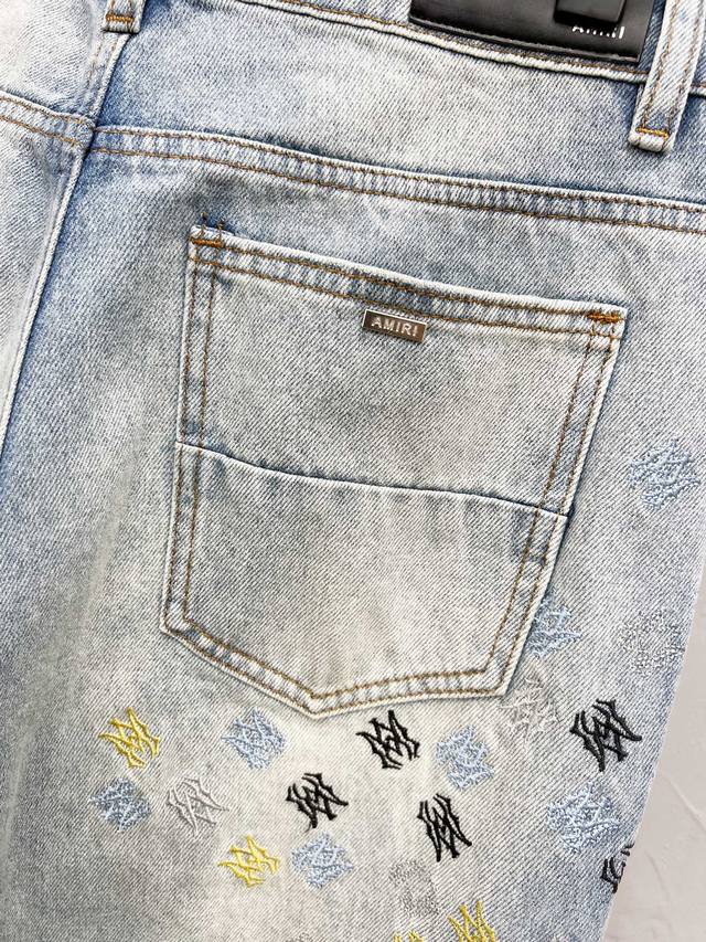 while maintaining a soft, textured feel. The washing process is meticulous, making it a must-have for everyone! Washed Amiri pants with all three labels. Color: Blue. Sizes: 30, 32, 34, 36