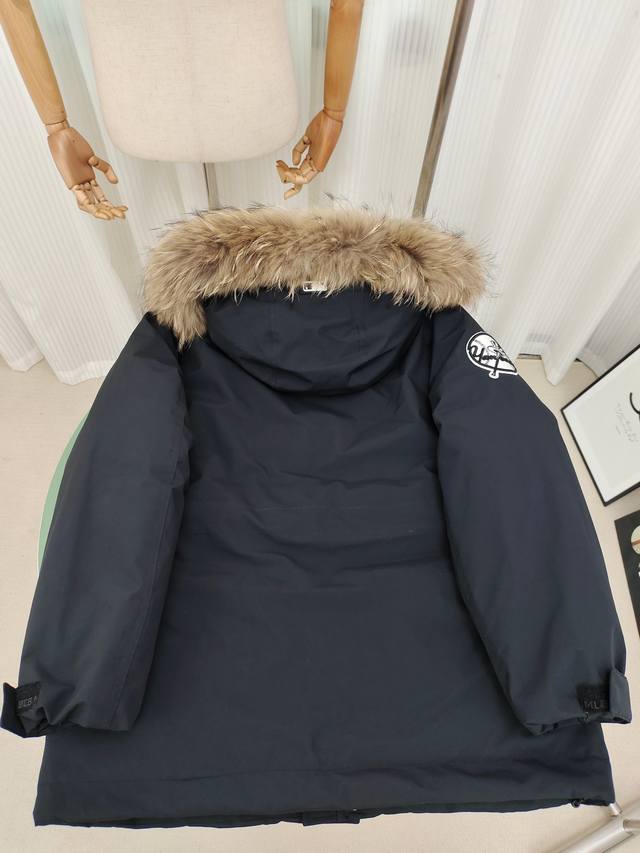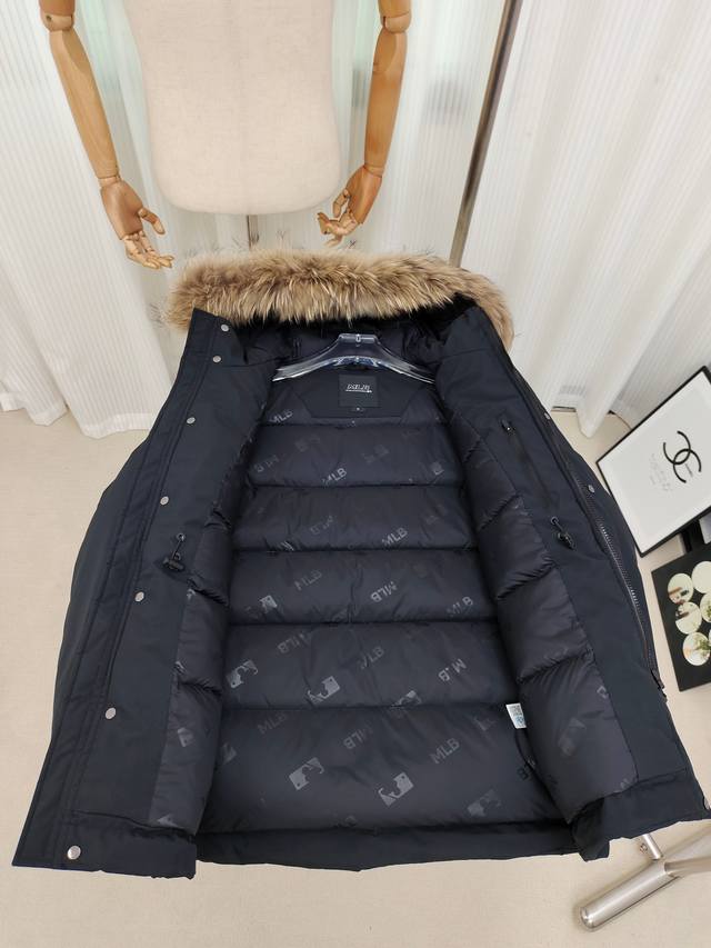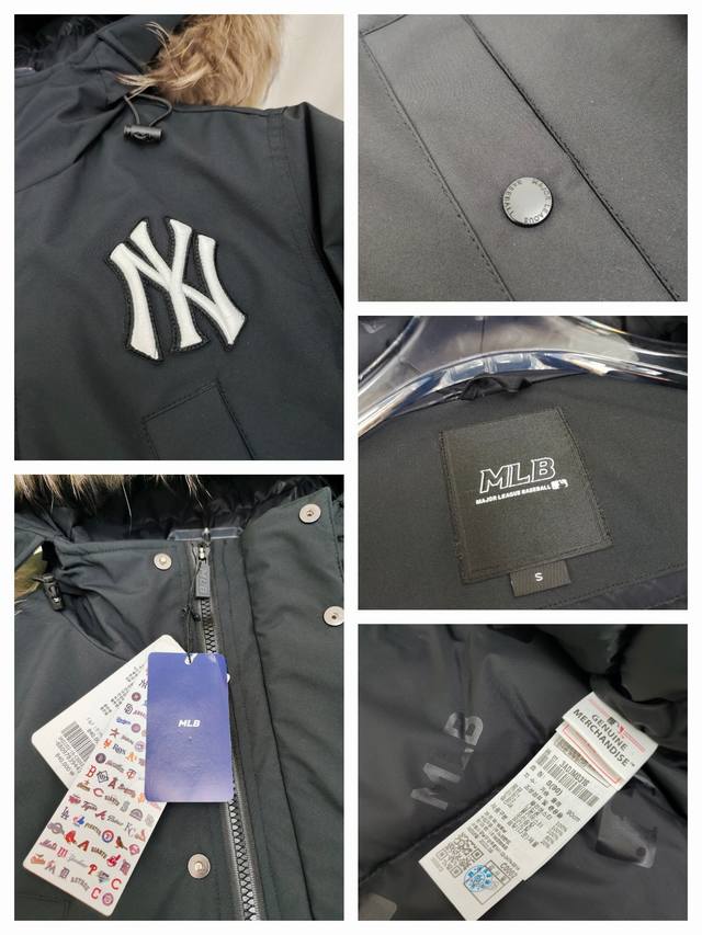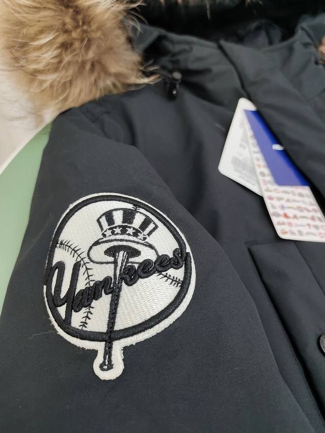 Genuine P-grade MLB down jacket with a workwear fur collar and sleeve badge.