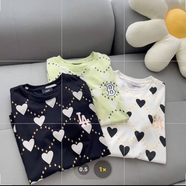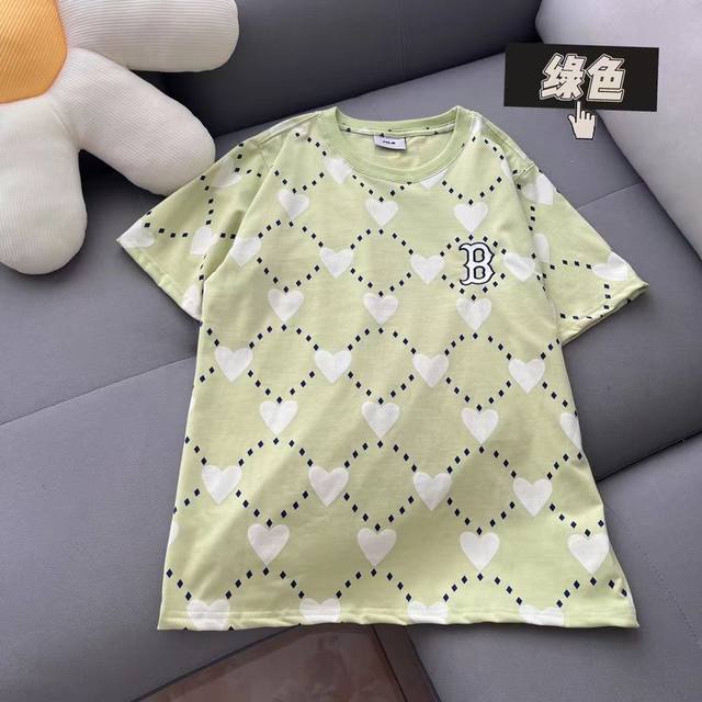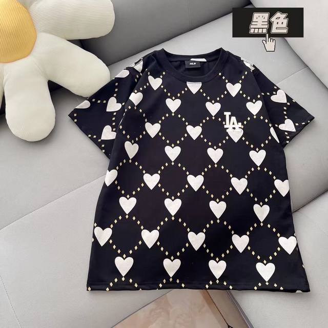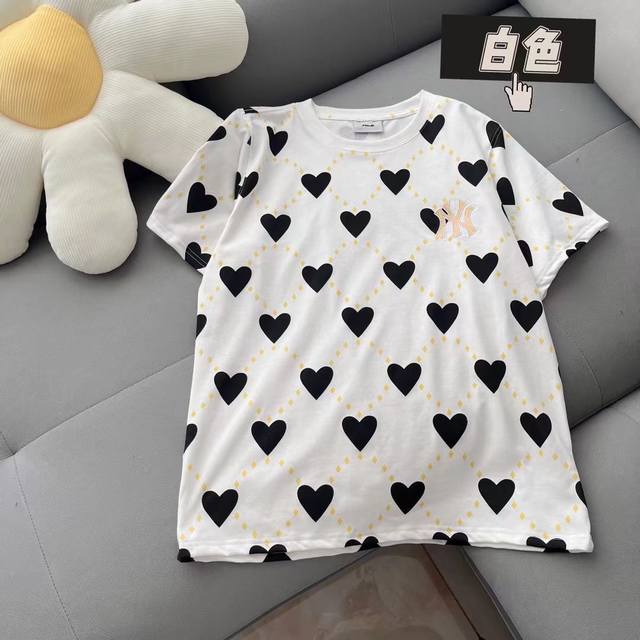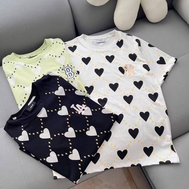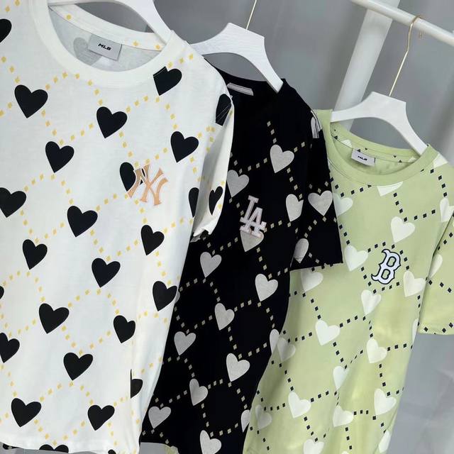 Korean trendy brand Mlb new all-over heart print short-sleeved shirt with embroidered logo on the front, unisex. The embroidered edges add a three-dimensional feel. The fresh and natural colors are vibrant and youthful, easily creating a summery look. Made with original 1:1 custom colors and fabric, 0 color difference. The tag supports QR code verification. One shirt, one size. High-quality