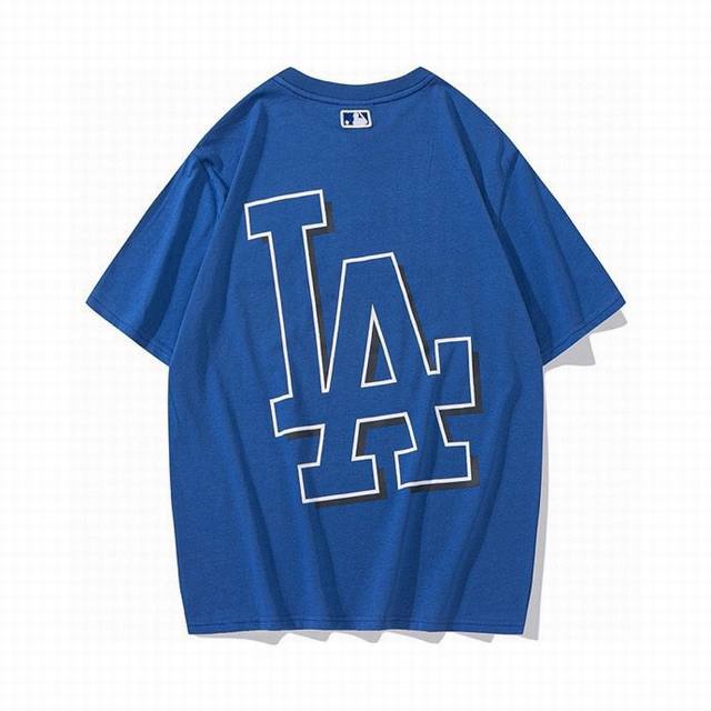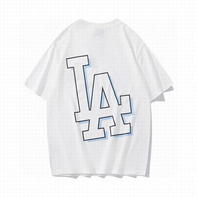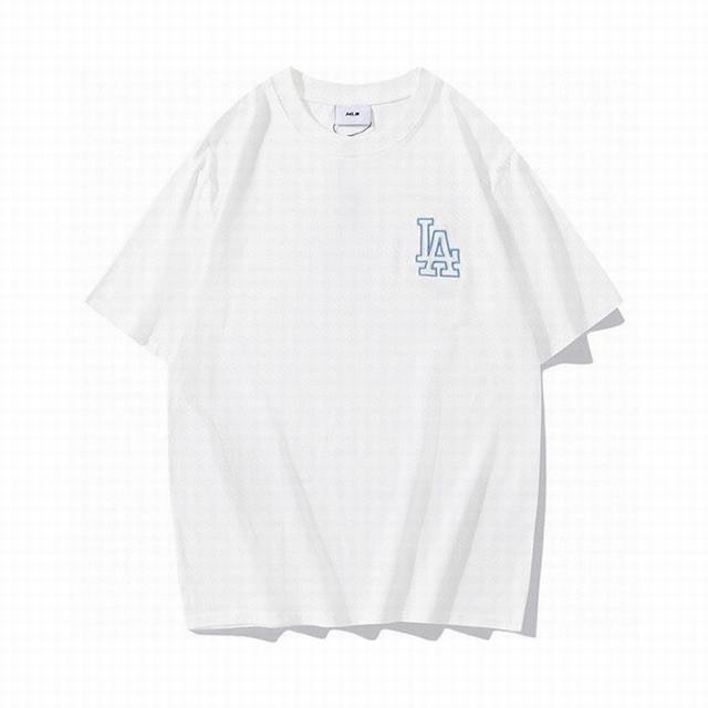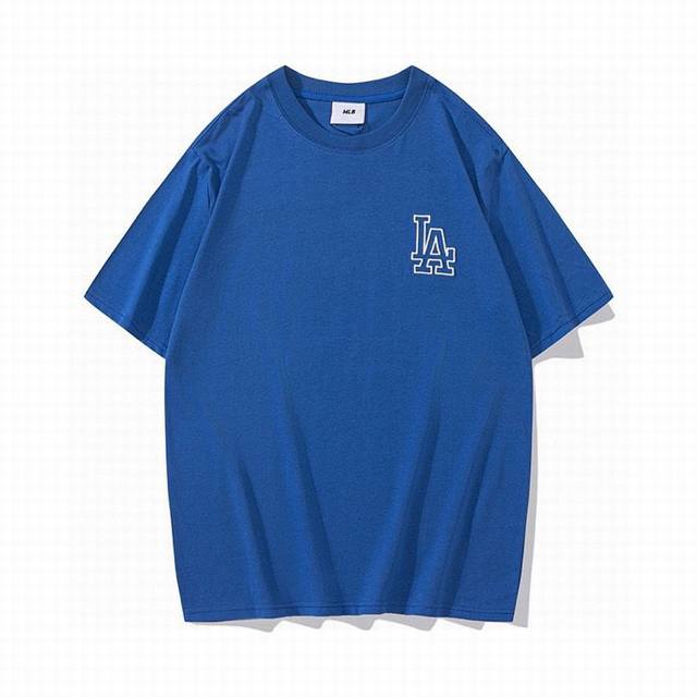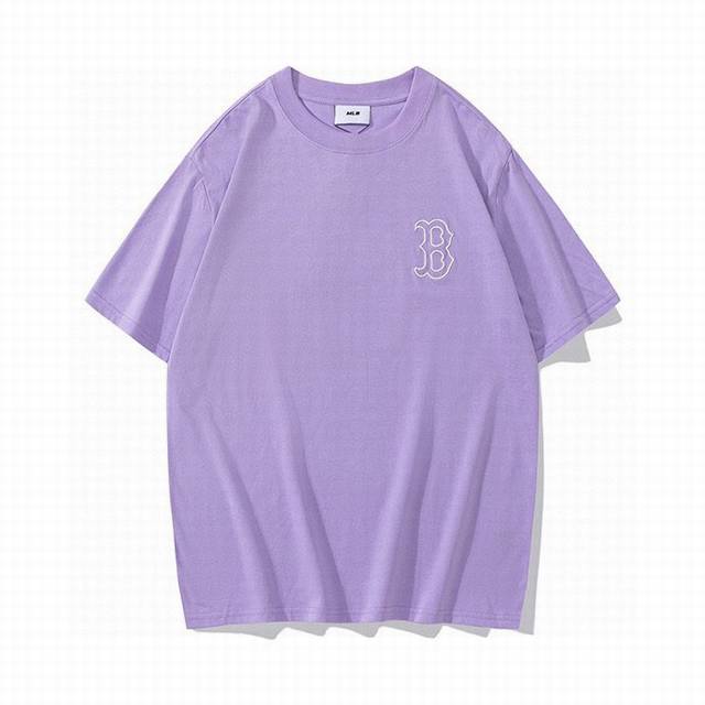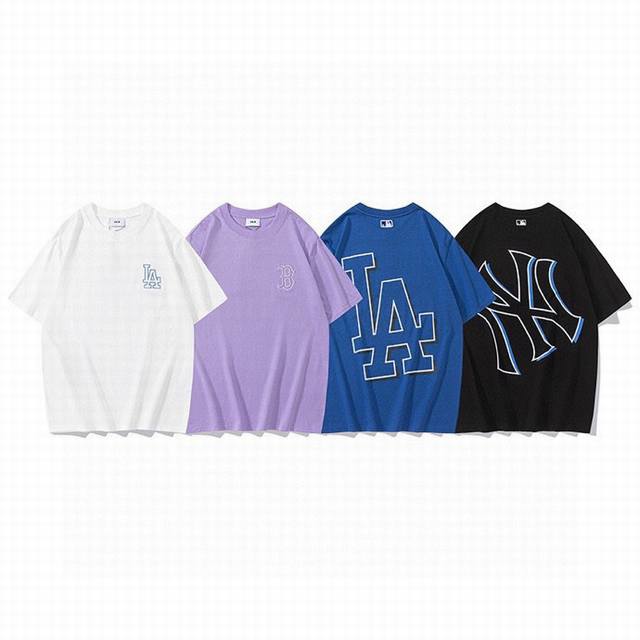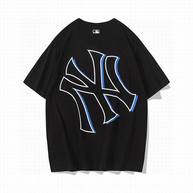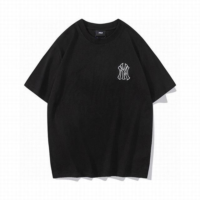 Korean trendy brand Mlb new short-sleeved shirt with a large logo on the back, unisex, featuring a new embroidered trim on the front for added dimension. The fresh and natural colors create a lively and youthful look, easily creating a summery feel. Made with original 1:1 custom colors and fabric, 0 color difference. The hangtag supports QR code verification. High-quality fabric: 260g double-yarn pure cotton. Colors: Black, White, Purple, Dark Blue. Sizes: S (Recommended for 110 lbs), M (Recommended for 130 lbs), L (Recommended for 150 lbs), XL (Recommended for 170 lbs), XXL (Recommended for 200 lbs).