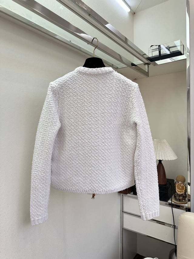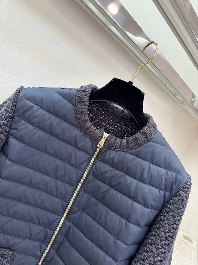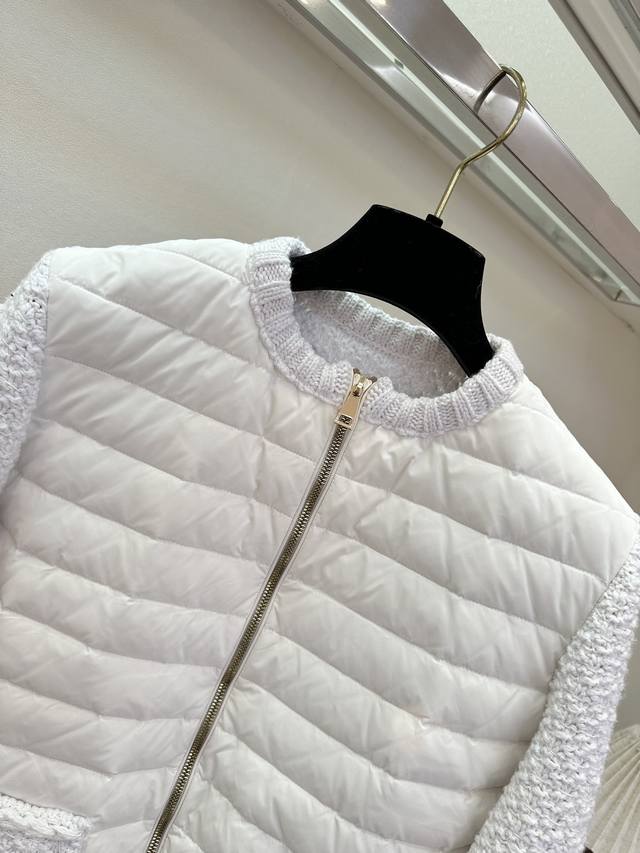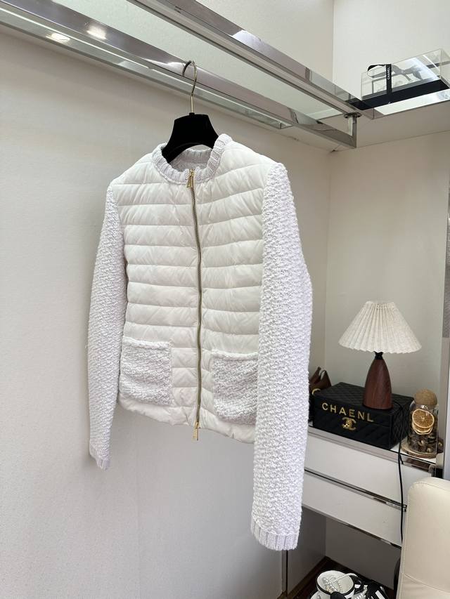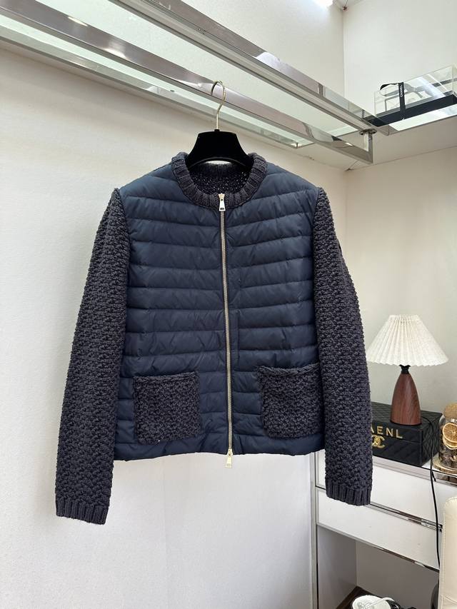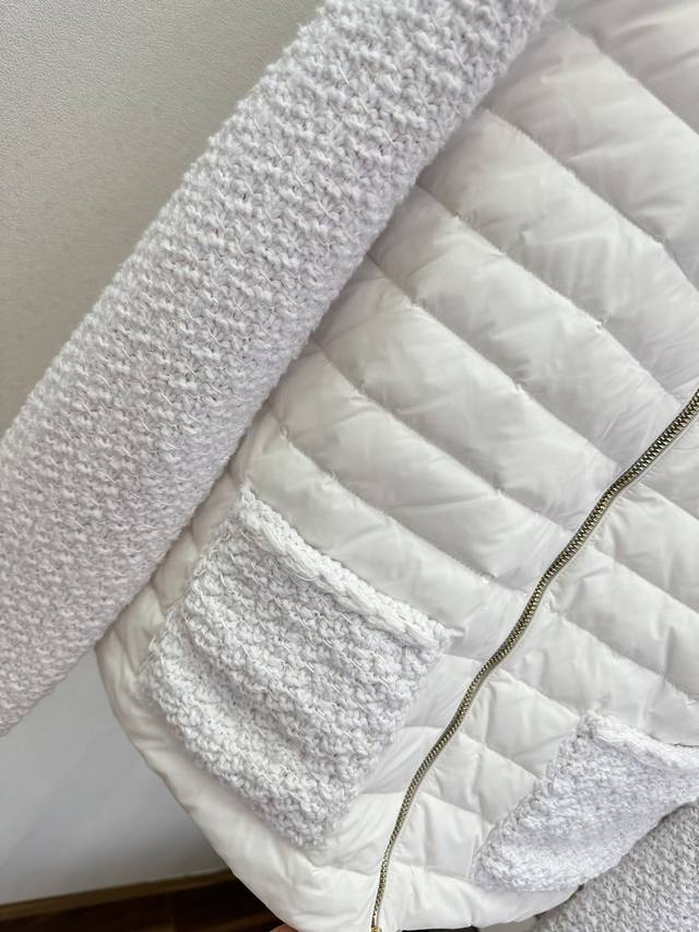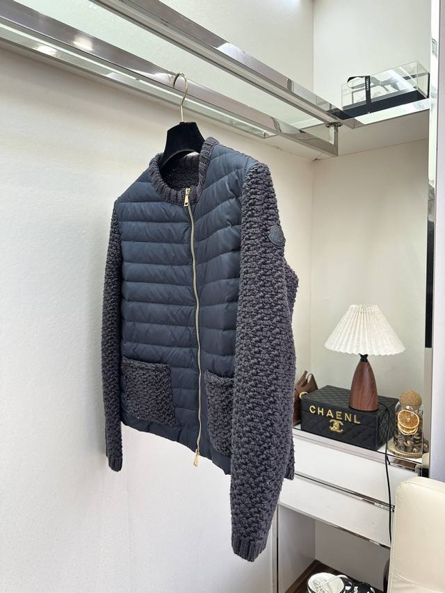 25 F Moncler's latest design features an intricate combination of two different fabrics that is truly eye-catching. The chemical reaction between down and crochet knitwear creates an instant sense of style and beauty. Sizes: S, M, L.