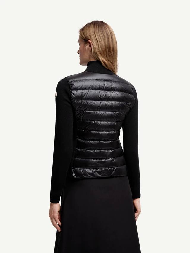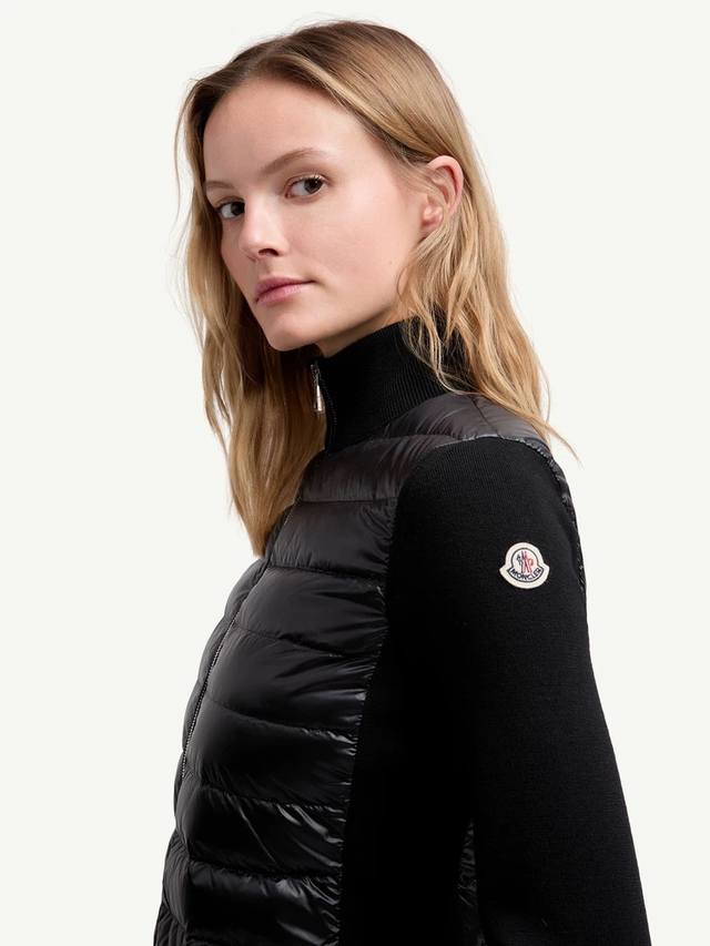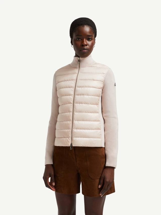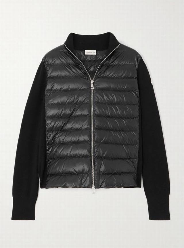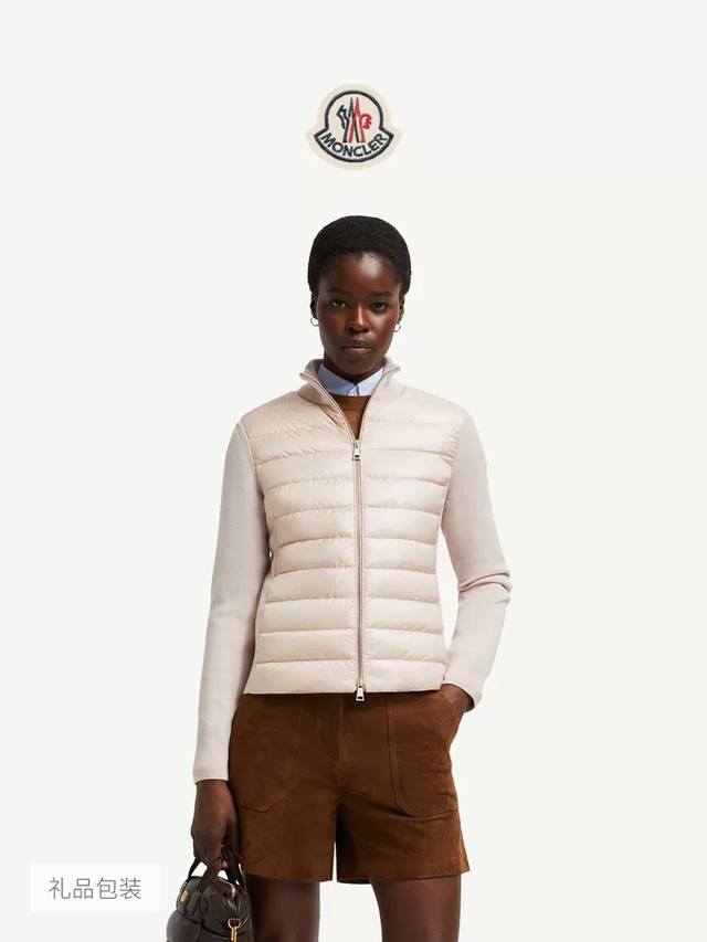 Moncler* New Arrival: High-end custom-made original letter logo hardware accessories, filled with 90% white goose down according to national standards, spliced knitted fabric, small logo sleeve patch decoration, slim fit, stand collar, long sleeves, lightweight down jacket. Price: P (excluding dust bag). Available in light pink, black, and off-white. Size M: Chest 96cm, Sleeve Length 63cm, Length 58cm. (Note: The last line appears to be a typo and can be left as is.)