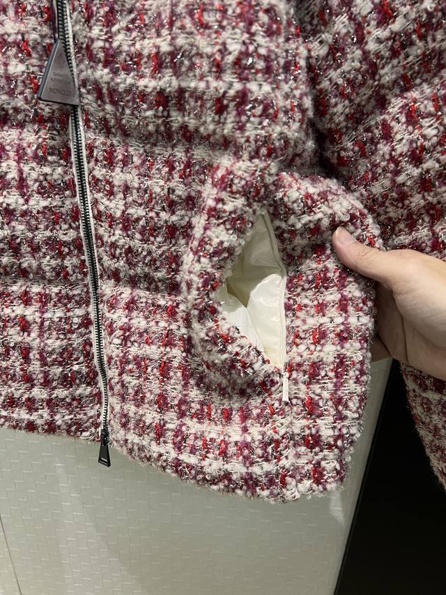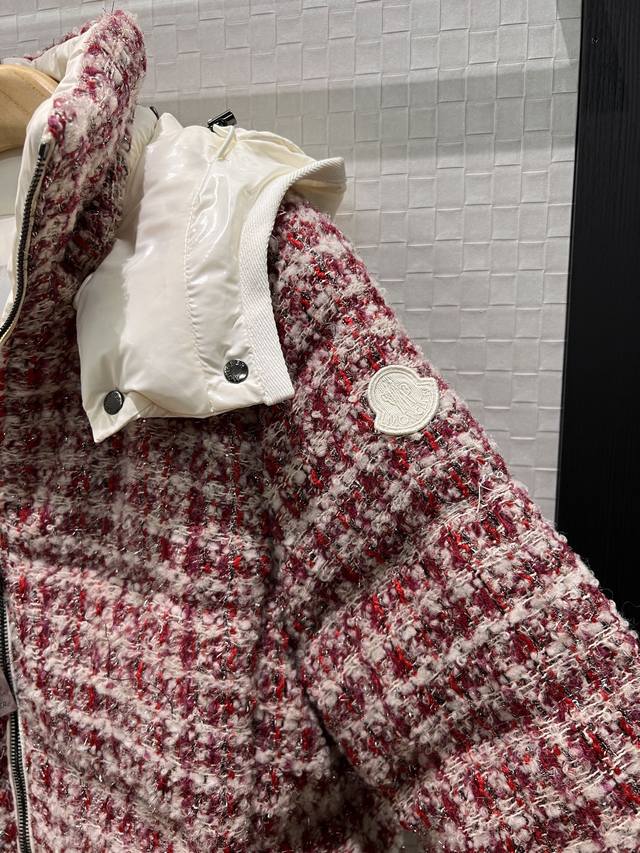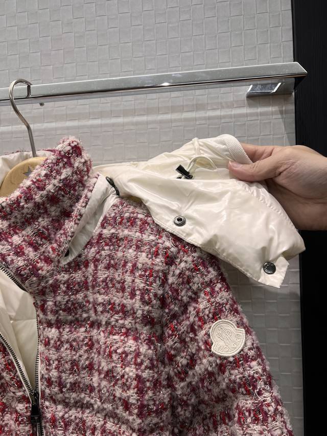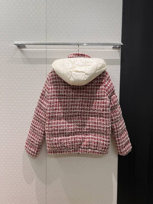 New Moncler Color Block Hooded Tweed Stand Collar Short Down Jacket Coat, Detach