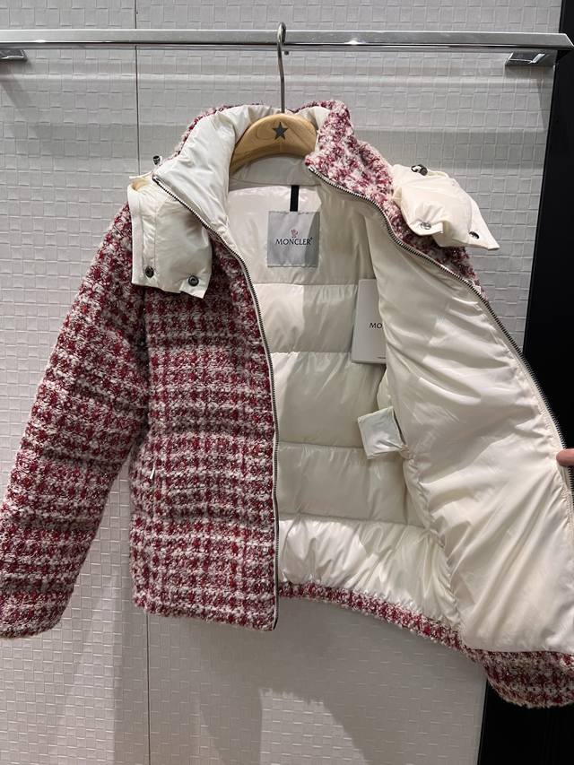 New Moncler Color Block Hooded Tweed Stand Collar Short Down Jacket Coat, Detachable Hood, Classic Cuff Label Logo Decoration, Hidden Pockets on Both Sides, 90% Down, 10% Feather Fill, Youthful, Casual, Warm, Versatile, Black, Red 012
