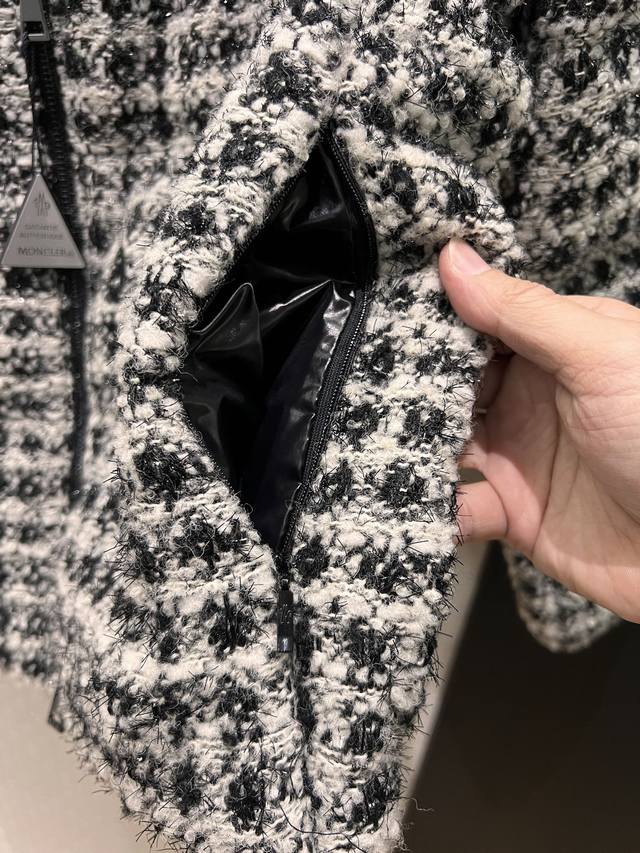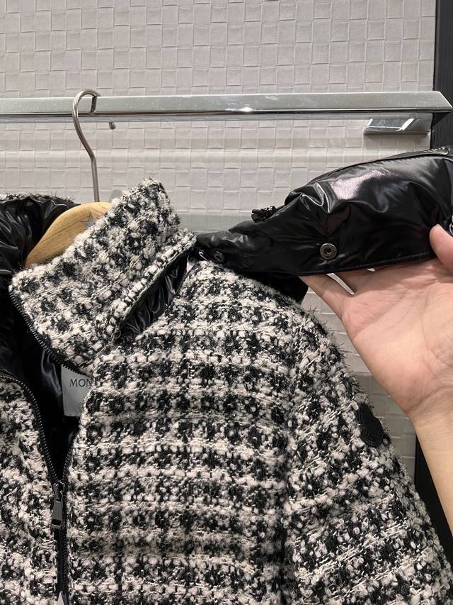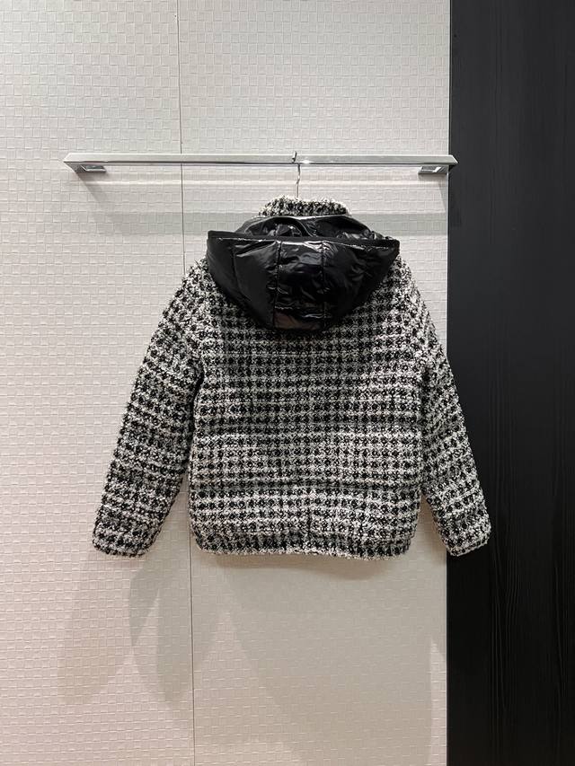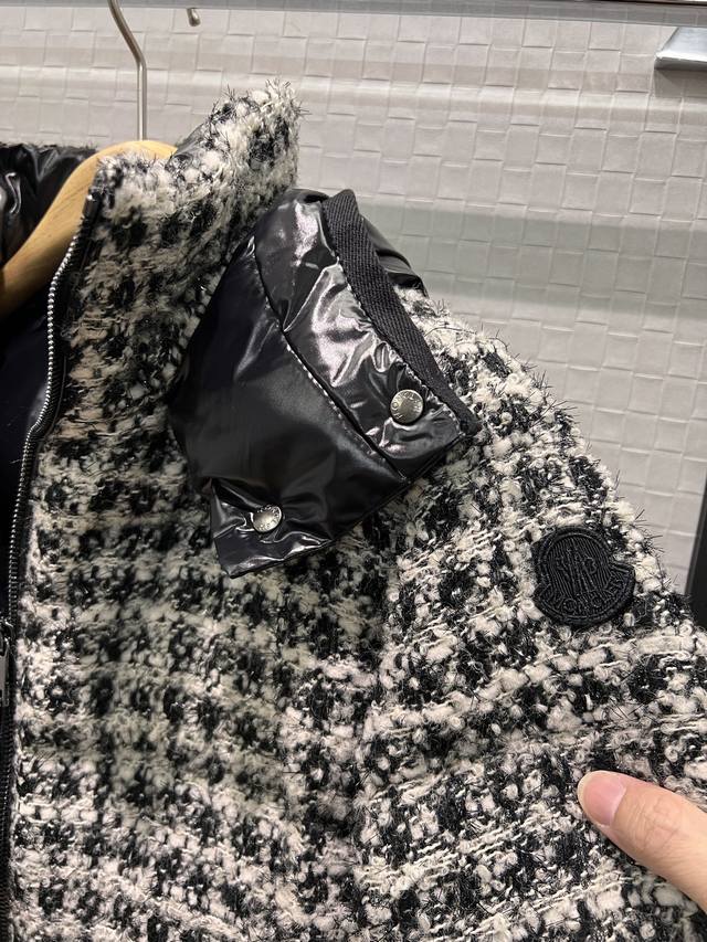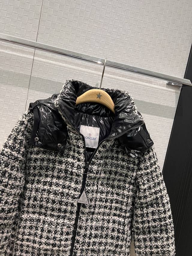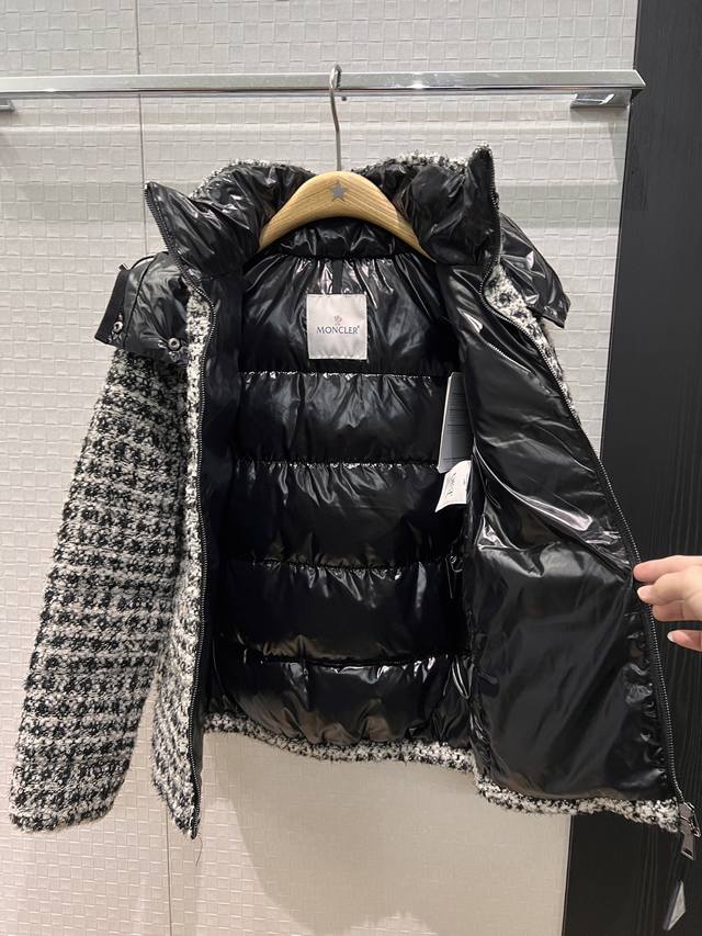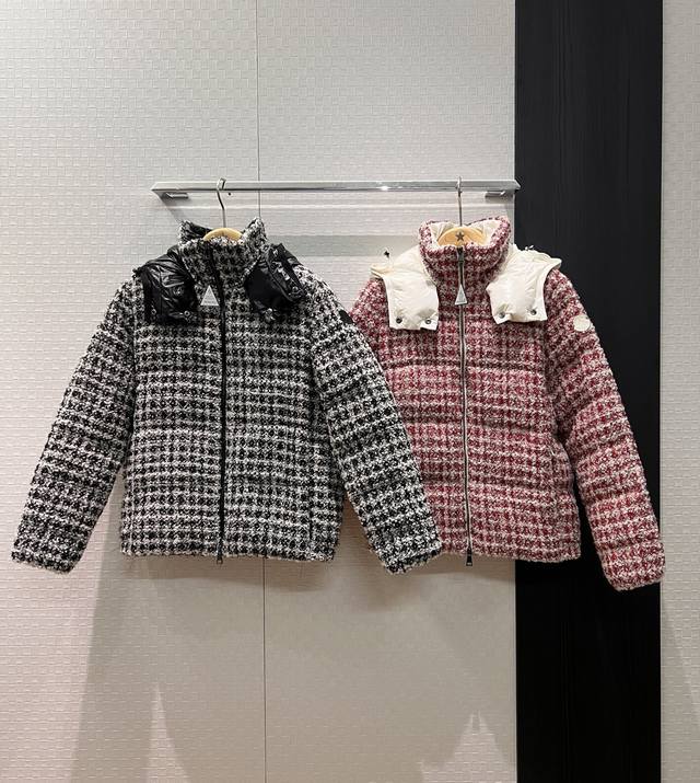 New Moncler Color Block Hooded Tweed Stand Collar Short Down Jacket Coat, Detachable Hood, Classic Cuff Label Logo Decoration, Hidden Pockets on Both Sides, 90% Down, 10% Feather Fill, Youthful, Casual, Warm, Versatile, Black, Red 012