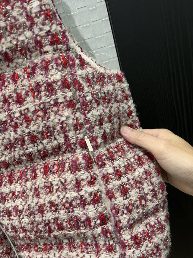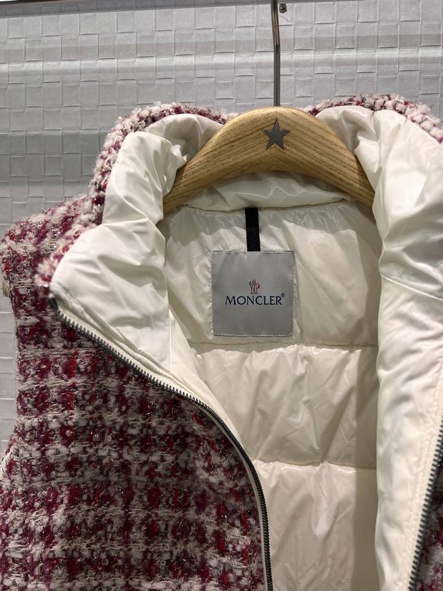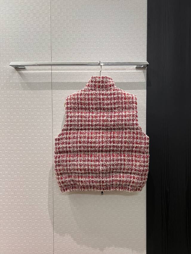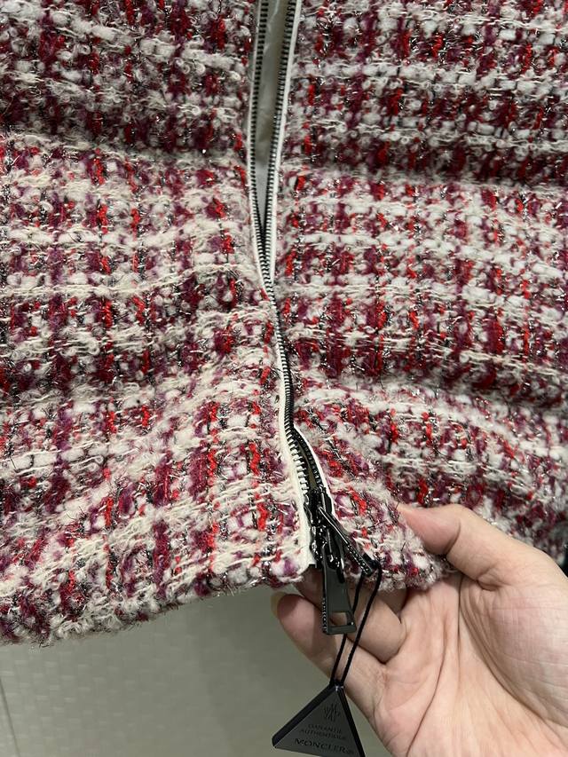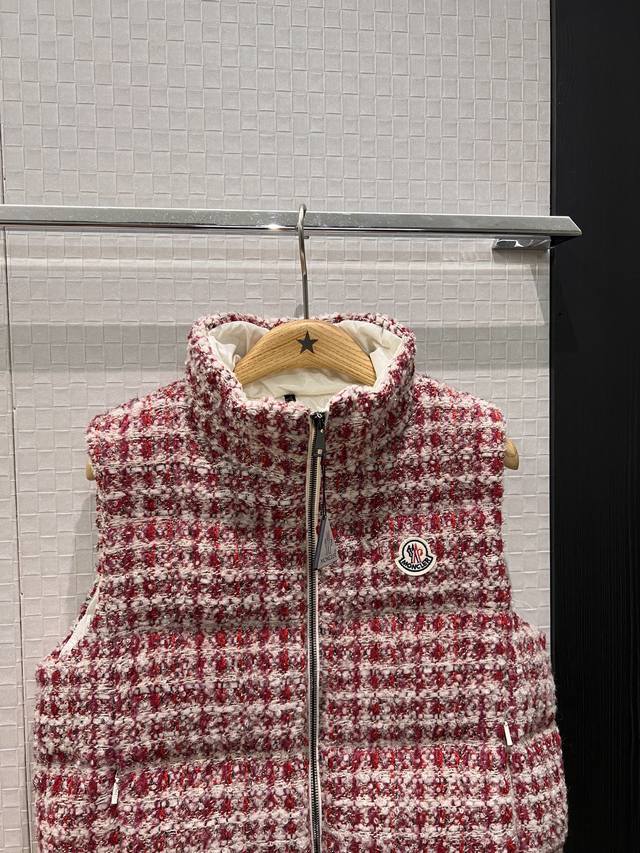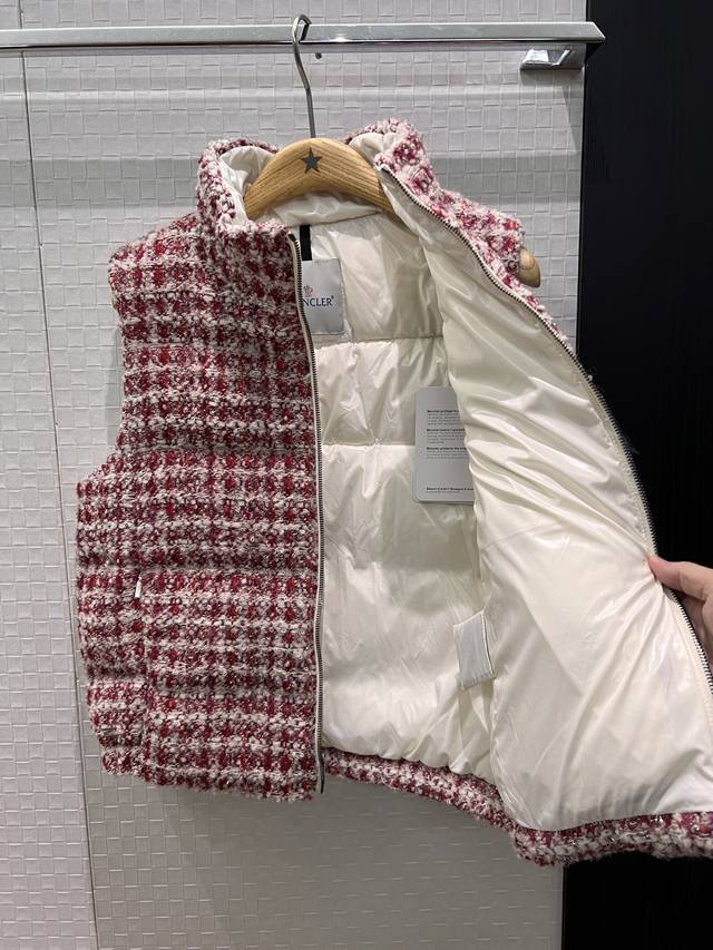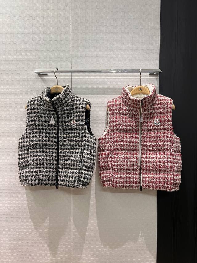 New Moncler Tweed Stand Collar Short Down Vest Jacket with Classic Logo Decoration on Chest and Hidden Pockets on Both Sides. 90% Down, 10% Feather Fill. Youthful, Casual, Warm, and Versatile. Black and Red. 012