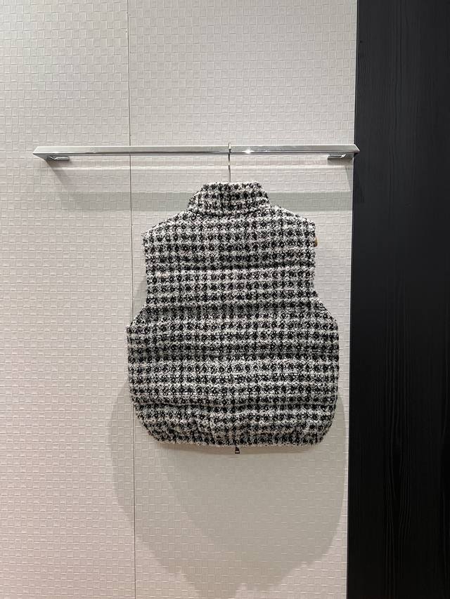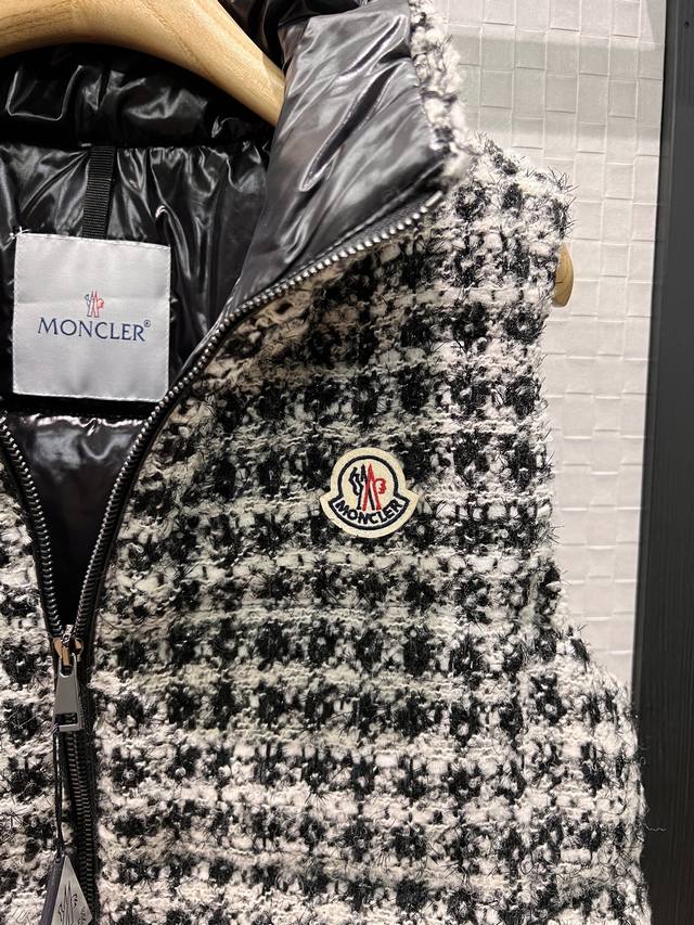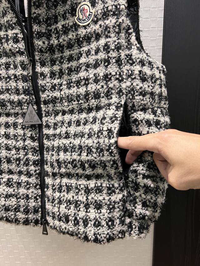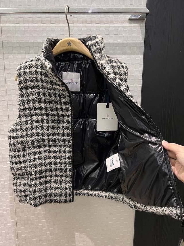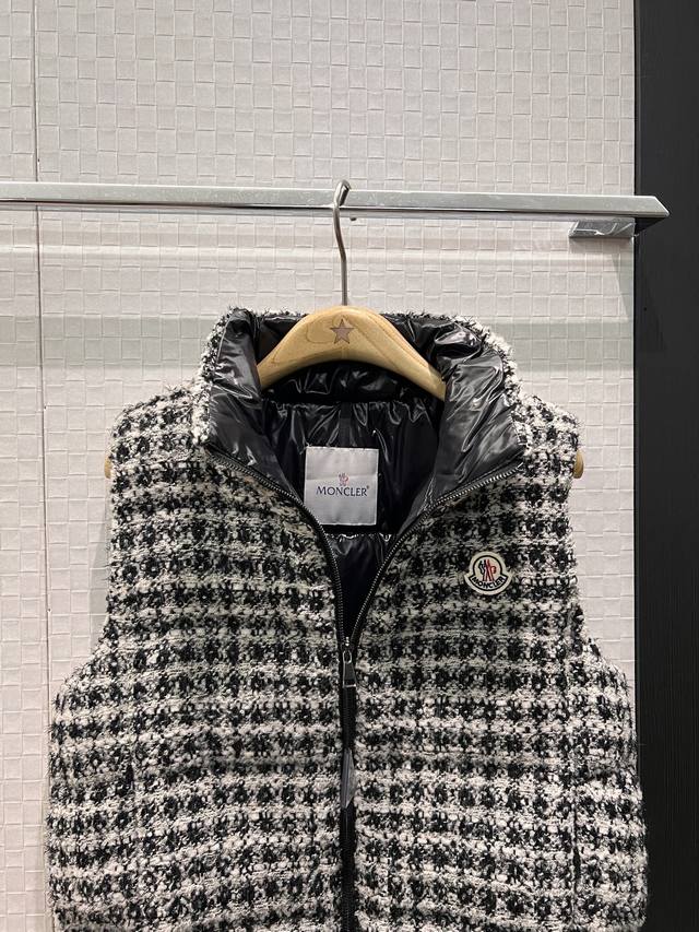 New Moncler Tweed Stand Collar Short Down Vest Jacket with Classic Logo Decoration on Chest and Hidden Pockets on Both Sides. 90% Down, 10% Feather Fill. Youthful, Casual, Warm, and Versatile. Black and Red. 012