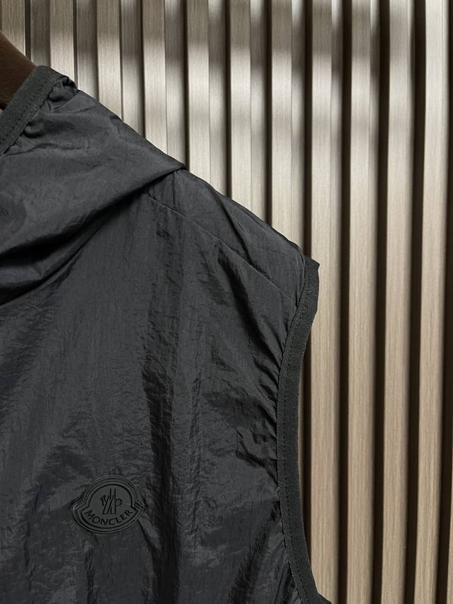 Moncler 2025 Spring and Summer new lightweight hooded vest, men's silicone logo outdoor technology nylon sleeveless jacket. A simple and distinctive outdoor sports item that can carry all styles of matching. The classic silicone nameplate logo embellishment and electroplated lettering metal zipper are enough to show the brand's charm and fashion sense. The hooded zipper sleeveless design allows for free movement while exercising without affecting the normal swing of the arms. Whether it is matching or casual wear, the lightness can show a unique charm. Custom-supplied imported technology nylon yarn fabric, light and breathable, iron-free and wrinkle-resistant. Very high-end texture, giving a very unique sense of wearing performance, excellent skin-friendly feel, extremely wearable, exquisite details, extremely perfect inner edging and stitching, first-class packaging, a rare and excellent product! Size: S-Xl