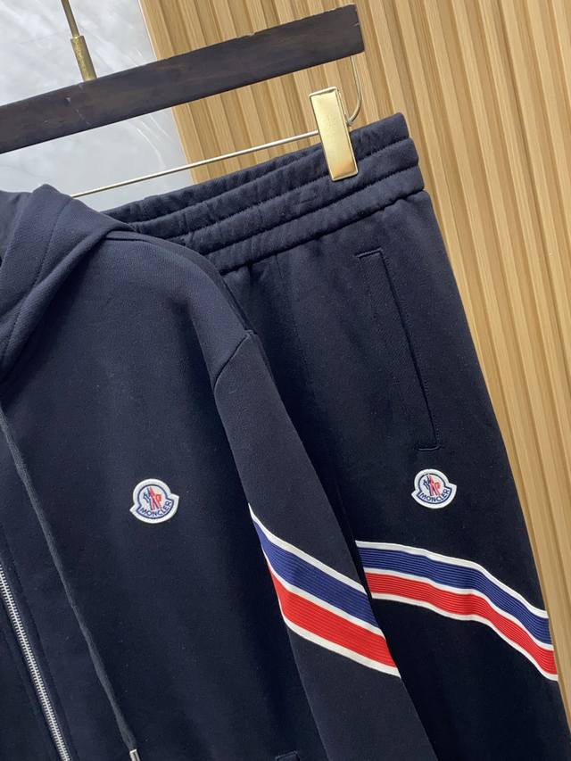 Moncler 25 New Tracksuit. This tracksuit is made of 100% cotton fabric with a ribbed design, drawstring closure, two large pockets, and an elastic waistband on the pants. The whole set looks amazing, is very comfortable to wear, and is great for both sports and casual wear. Unisex style, highly recommended! Sizes 48-56