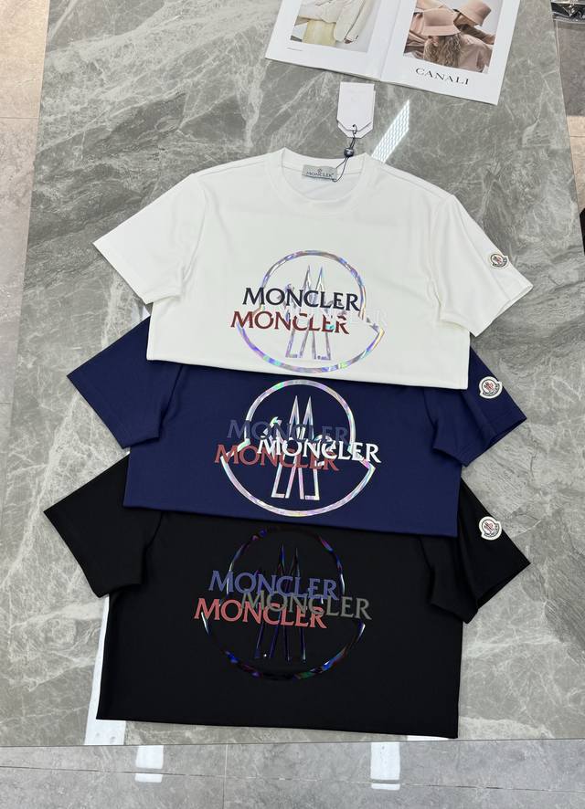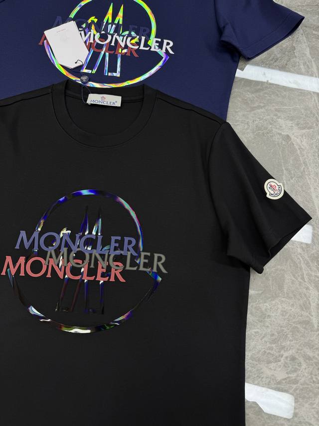 Moncler 25S New Modal Short-Sleeve T-Shirt, classic crew neck design, made of soft G Modal cotton fabric, comfortable and breathable. Features a distinctive brand logo with a color gradient on the front. Available in black, dark blue, and white, versatile and flattering for all body types, easily worn for everyday or casual occasions in spring and summer. Stylish and practical, it pairs well with jeans or sweatpants! Sizes: M-3XL slim fit! S and 4XL can be custom-made. L is recommended for someone 175cm tall and weighing 140kg.