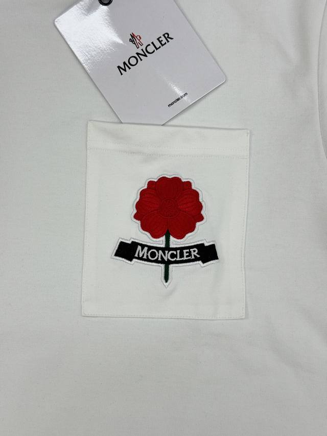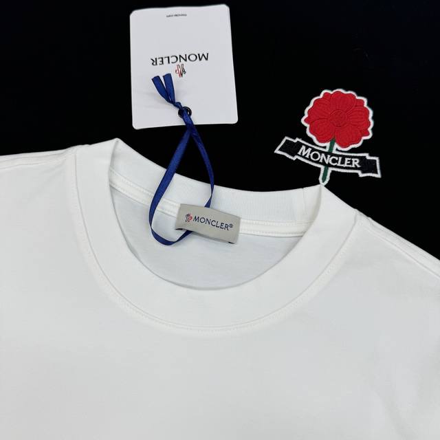 Moncler 26S New Qixi Festival Limited Edition Embroidered Short-Sleeve T-Shirt, unisex, made of comfortable pure cotton, with a chest pocket design. Features red flower embroidery and a bell logo, with the Moncler logo embroidered on the flower stems. The 3D embroidery details are exquisite. The round neck design is simple and versatile, easy for both men and women to wear, and also great for couples! Colors: Black, White. European Sizes: S-XL. Recommended size: M (175cm, 145kg).