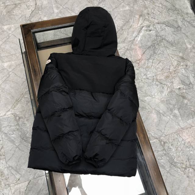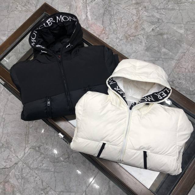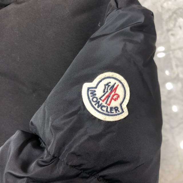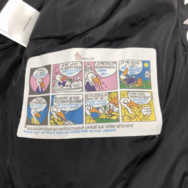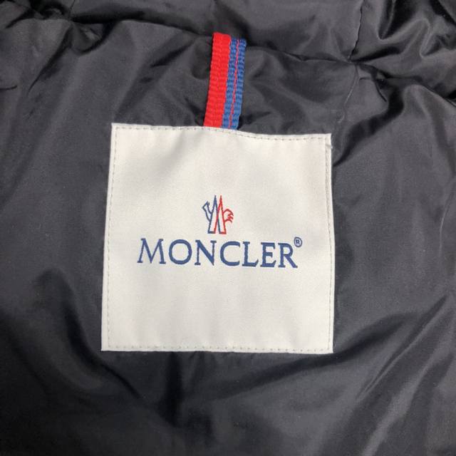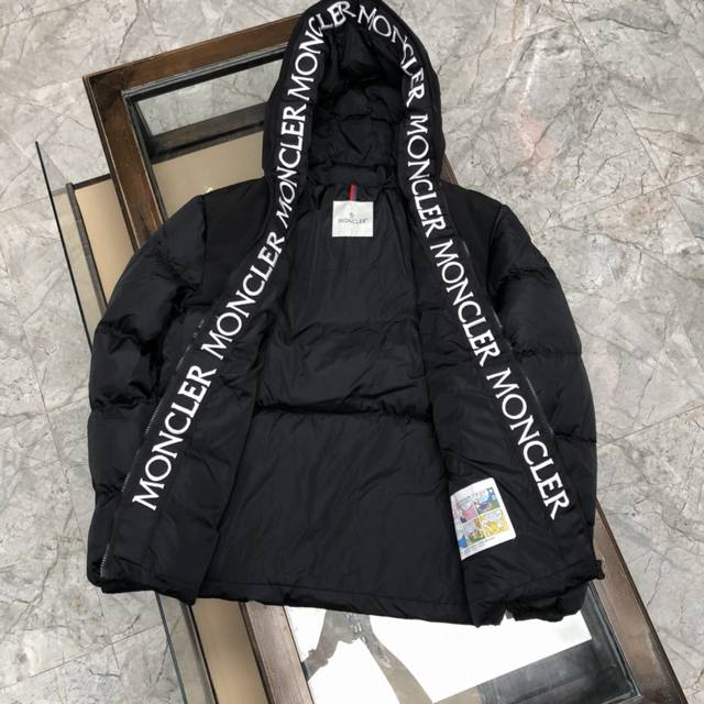 Moncler down jacket with large embroidered ribbon and monogram. This upgraded version features the same logo with sensor-activated anti-counterfeiting technology as the store's original NFC technology. Filled with 90% white duck down for a fluffy and full feel, custom-made fabrics and original hardware molds. The placket features large embroidered ribbon hem with monograms. Available in unisex styles.