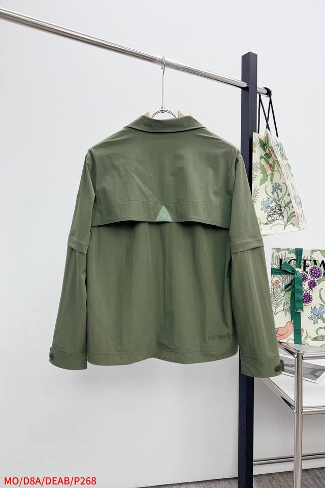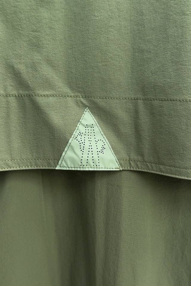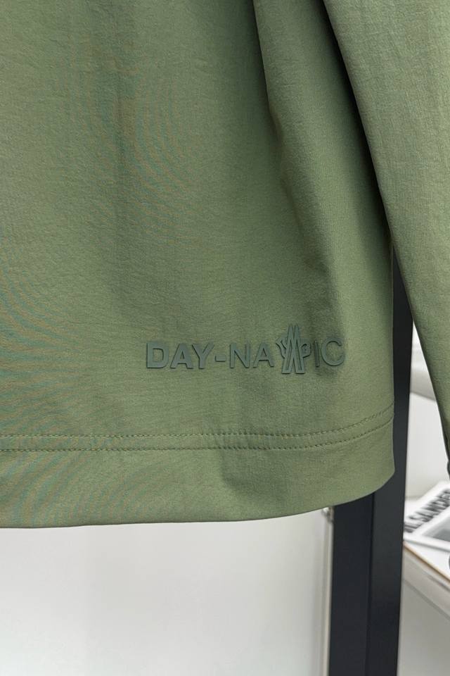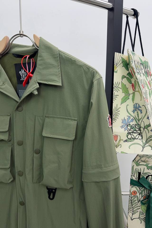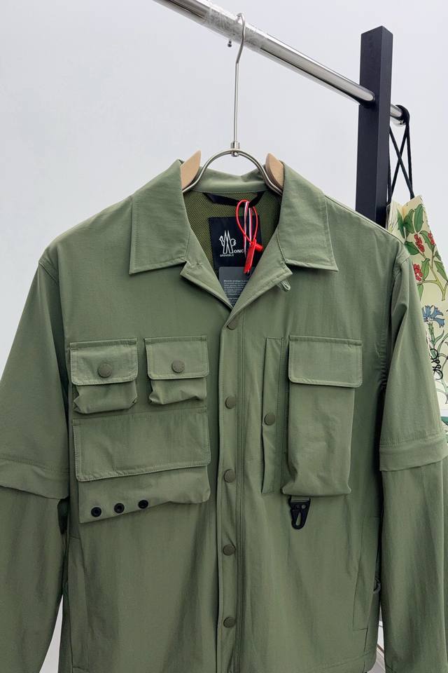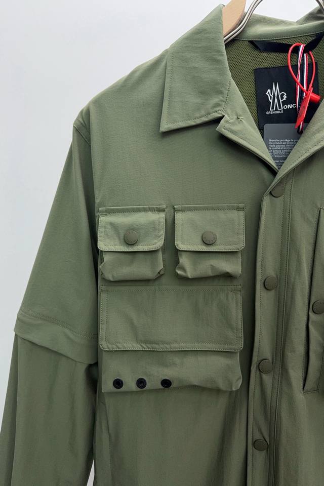 . Custom-dyed double-stretch mercerized poplin and soft mesh pongee for exceptional comfort and next-to-skin comfort. Inspired by plant-based textures, the dark green hue is inspired by dew-soaked sage leaves. The functional pocket system offers a precise narrative, balancing functionality and aesthetics. The iconic Moncler logo is instantly recognizable on the sleeve, and the tonal triangular logo blends seamlessly into the fabric like a mark in a deep-sea undercurrent. Removable sleeves allow for versatile styling.