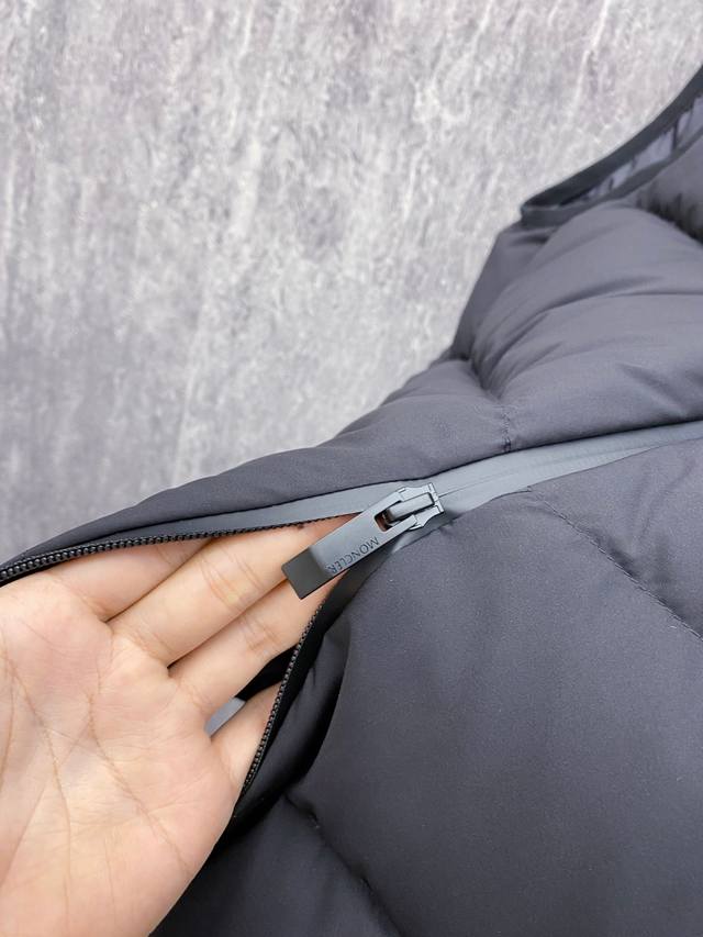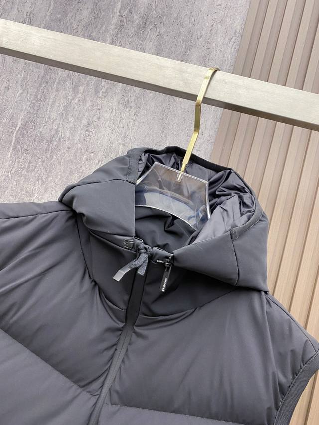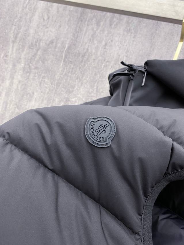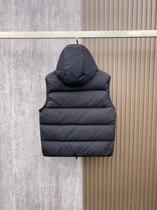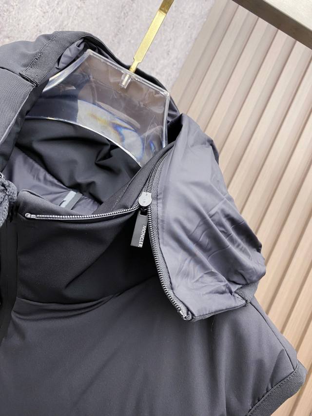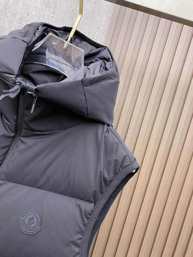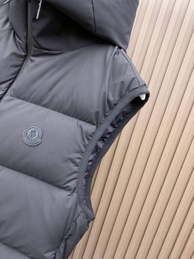 Moncler Valmasque Men's Detachable Hooded Down Vest. Original Purchase and Development. Premium Goose Down Filling, Original Replacement Fabric, Original Hardware. The Valmasque men's down vest features a streamlined aesthetic design inspired by the clean lines of classic 90s fashion. Made from lightweight, functional nylon fabric, it blends 90s minimalism with modern practicality. It includes a detachable hood and logo detailing on the zipper closure. Details: Made from fine, soft nylon fabric; filled with down; detachable hood; zipper closure; zippered pockets; elastic trim; interior logo trim; Size: 1-5; Black/Off-White; Highest quality version on the market.
