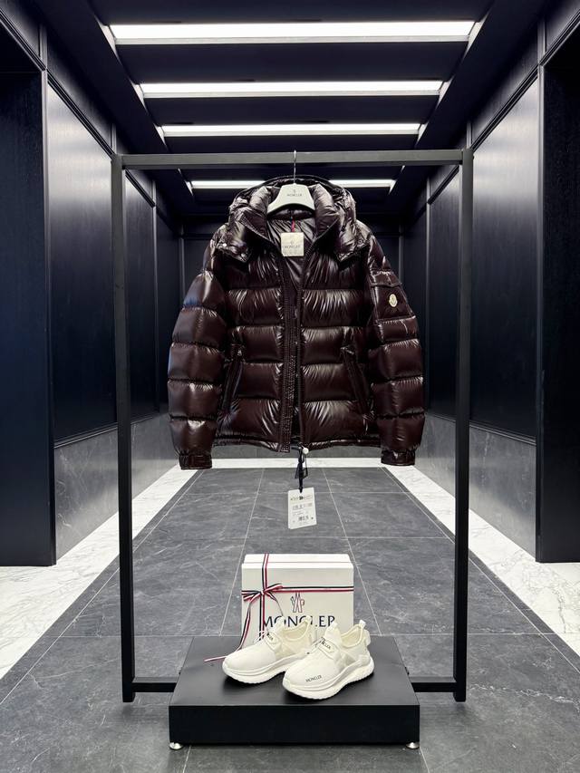Price Increase! Premium Down Moncler Maya Classic Short Down Jacket. Limited Edition Dark Brown Chocolate, the only color on the market that matches the original, filled with premium goose down. Comes with a full set of counter gift box packaging. Upgraded original magnetic gift box. The Moncler Maya short down jacket is a classic Moncler item with a highly recognizable style. Made of patent nylon, it is available in a variety of colors and is a stylish casual or workwear item. The Moncler Maya men's down jacket is made of shiny patent nylon with the signature rectangular quilting, a quintessential Moncler style. A classic short design that transcends seasons and fashion, it features a distinctive silhouette, a detachable hood, and an adjustable hem. Classic patch pockets adorn the cuffs, showcasing the brand's iconic style. Details: Made of coated nylon; Coated nylon lining; Down filling; Rectangular quilted stitching; Detachable hood with snaps and drawstring adjustment; Two-way zip placket; Exterior and interior zip pockets; Adjustable elastic cuffs with snaps; Drawstring hood; Flap pockets on sleeves; Sleeves adorned with the Moncler felt logo; Size: 1-5; D00830