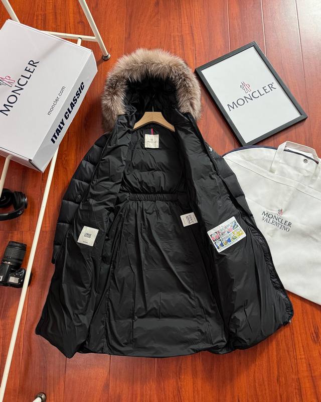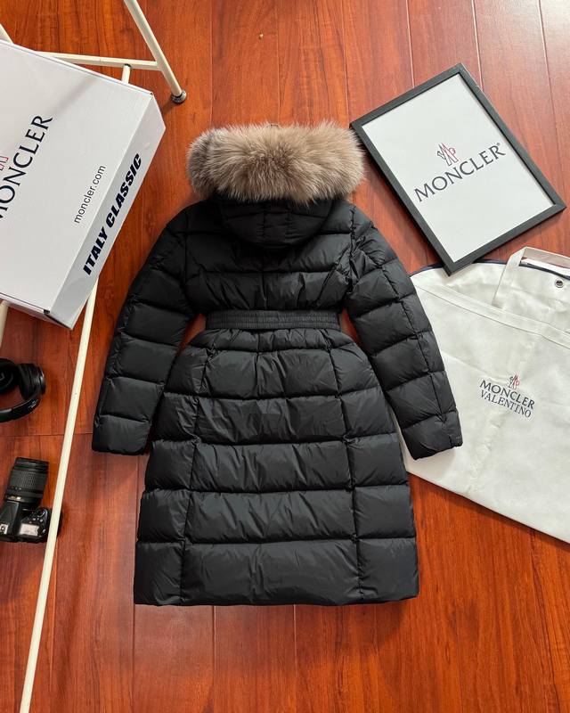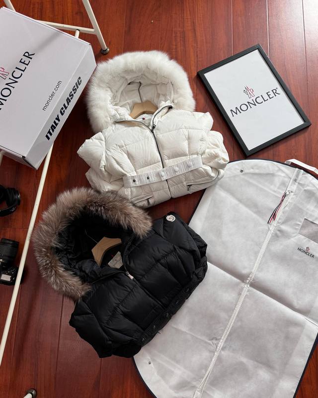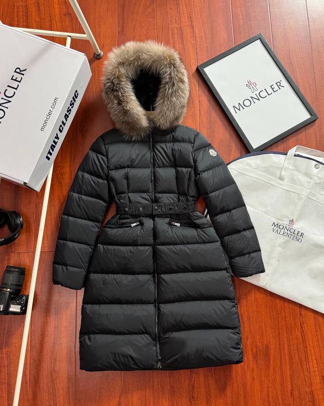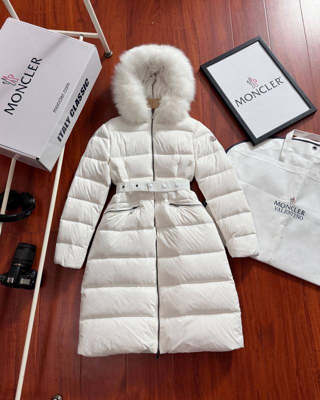 90% down jacket for resellers, supports chip sensing. Comes with a tote bag +10, packaging box +10. Moncler Hermifur series mid-length women's down jacket. Heavy-duty nylon down long down jacket. Features a detachable fox fur collar with a hood. Color-plated die-cast zipper and invisible snap buttons on the front placket. Comes with a natural-colored belt with three-section snap buttons for adjustable fit. Four inner seams on both sides of the waistband for a slimming effect. Double-layer flap pockets with black painted snap buttons. All colors come with a natural-colored belt with three-section snap buttons for adjustable fit. Soft and comfortable fabric, good down loft, slim fit, lightweight, warm, and not bulky. Colors: White, Black. Sizes: 1, 2, 3, 4.
